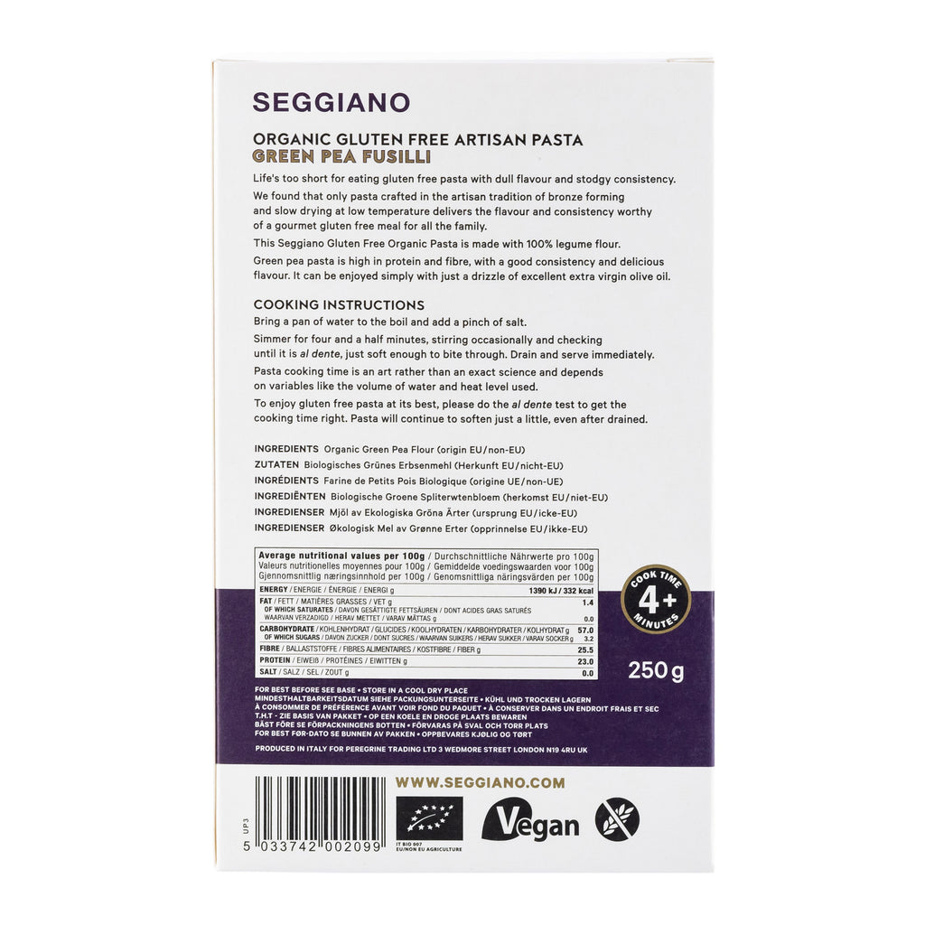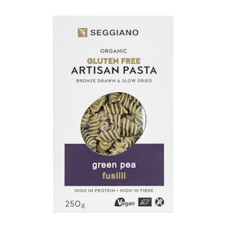 "Life's too short for eating legume pasta with a dull flavour and stodgy consistency. the Seggiano found that only pasta crafted in the artisan tradition of bronze forming and slow drying at low temperature delivers the flavour and consistency worthy of a gourmet gluten free meal for all the family. This Seggiano gluten free organic pasta is made with 100% legume flour. Green pea pasta is high in protein and fibre, with a good consistency and delicious flavour. It can be enjoyed simply with just a drizzle of excellent extra virgin olive oil. Produced by a family business, using innovative combinations of corn, rice, buckwheat, legumes, quinoa & teff, our certified gluten free pasta range offers interesting nutritional variety and digestibility with delicious flavour. "