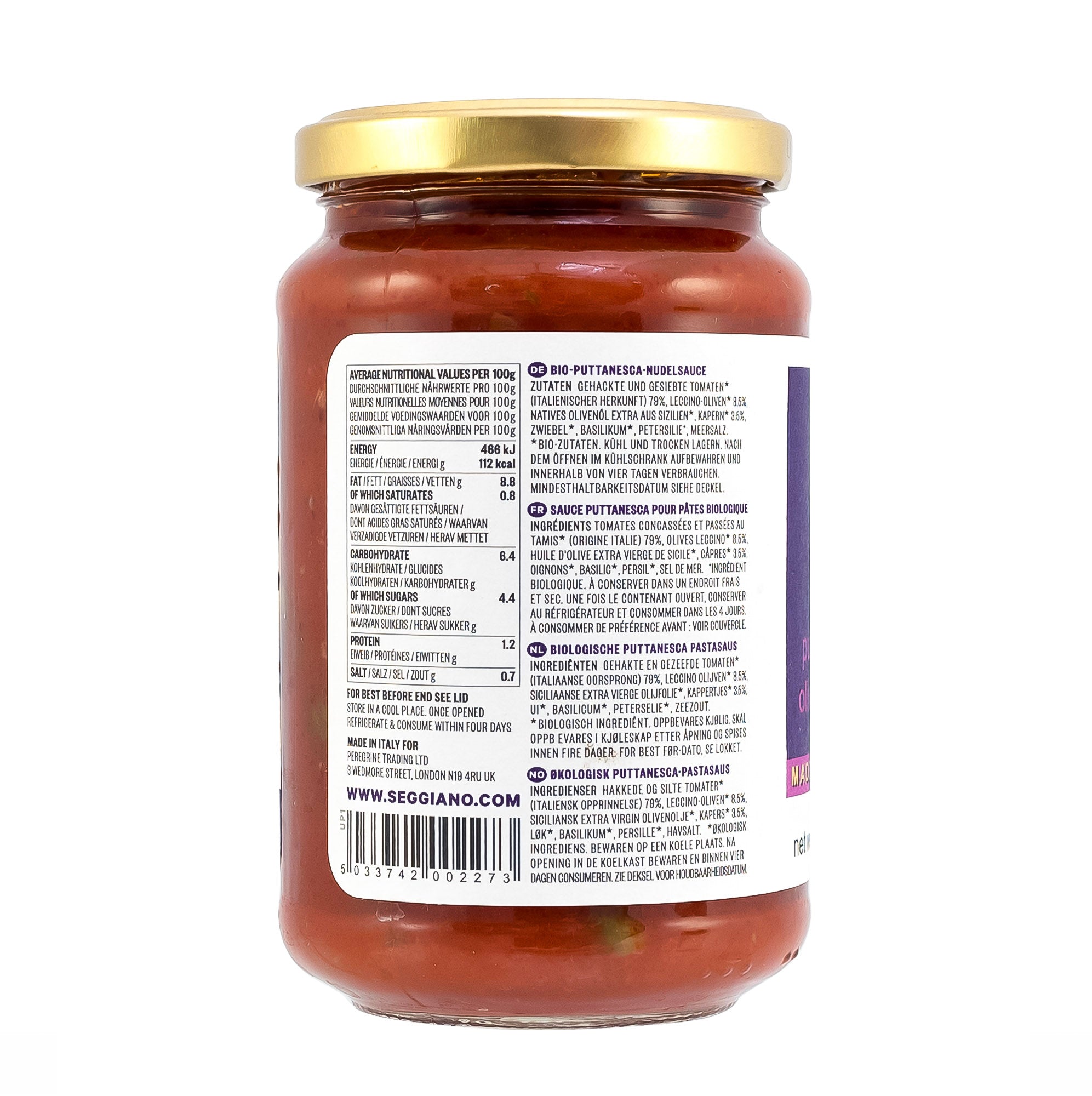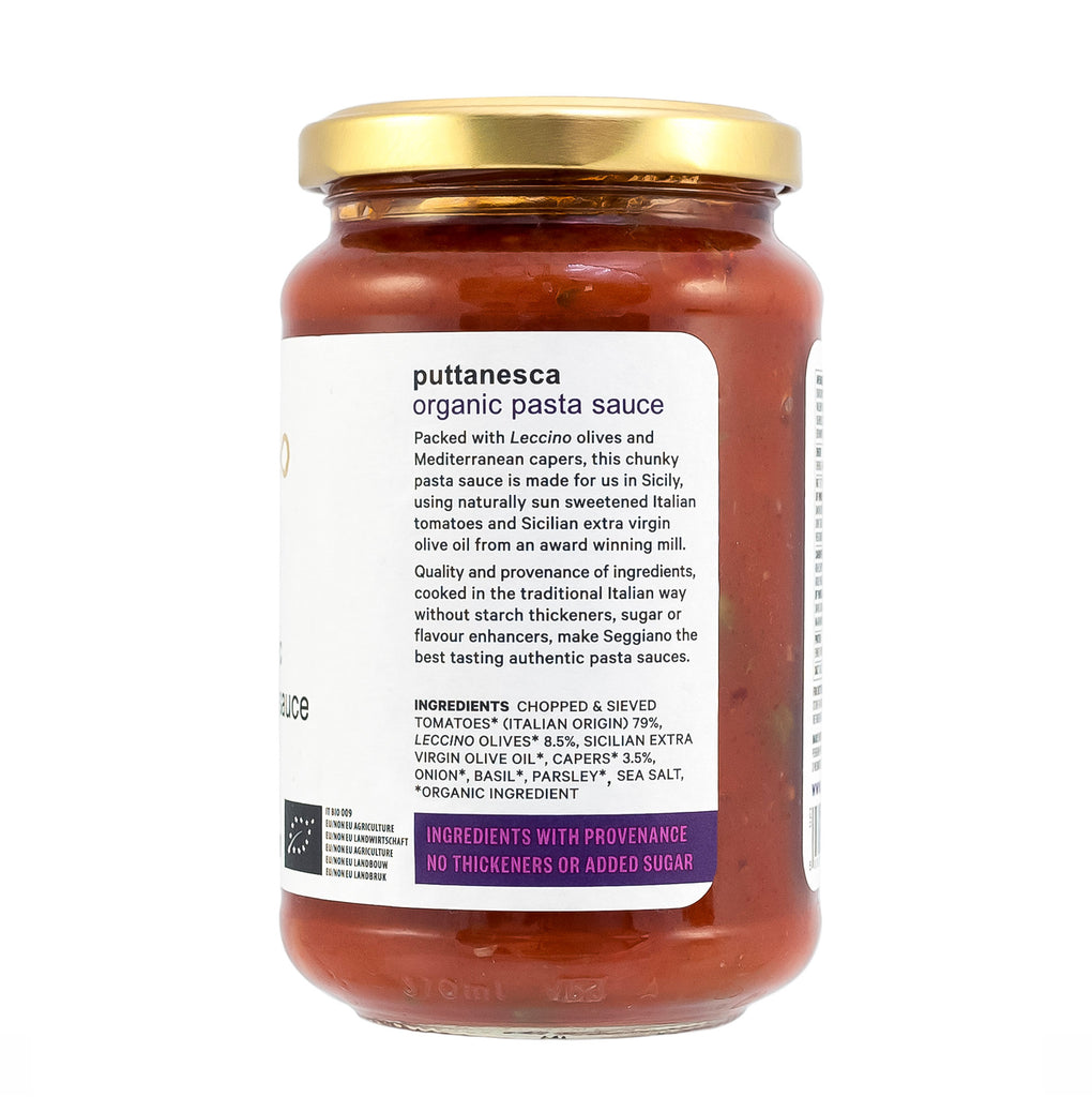 "Packed with Leccino olives and Italian capers, this chunky pasta sauce is made for us in Sicily, using naturally sun sweetened Italian tomatoes and Sicilian extra virgin olive oil from an award winning mill. Quality and provenance of ingredients, cooked i"