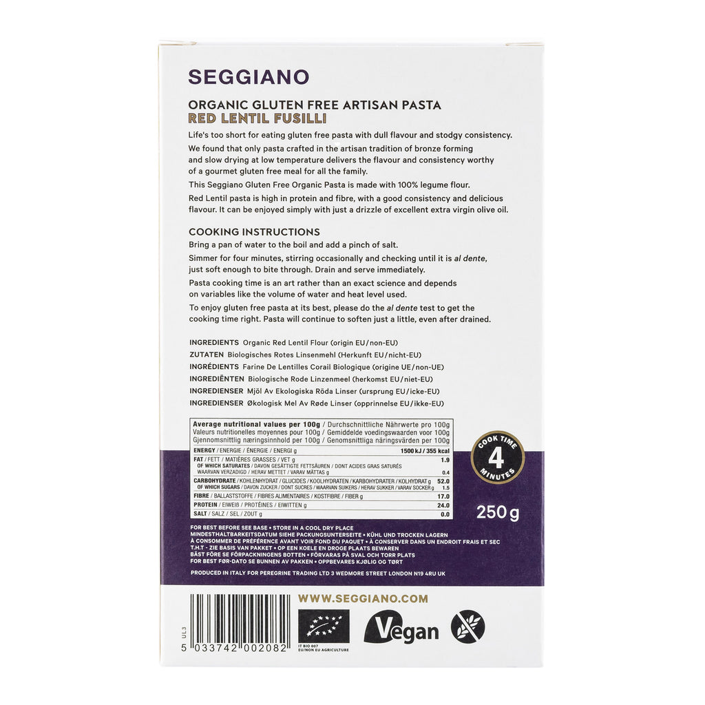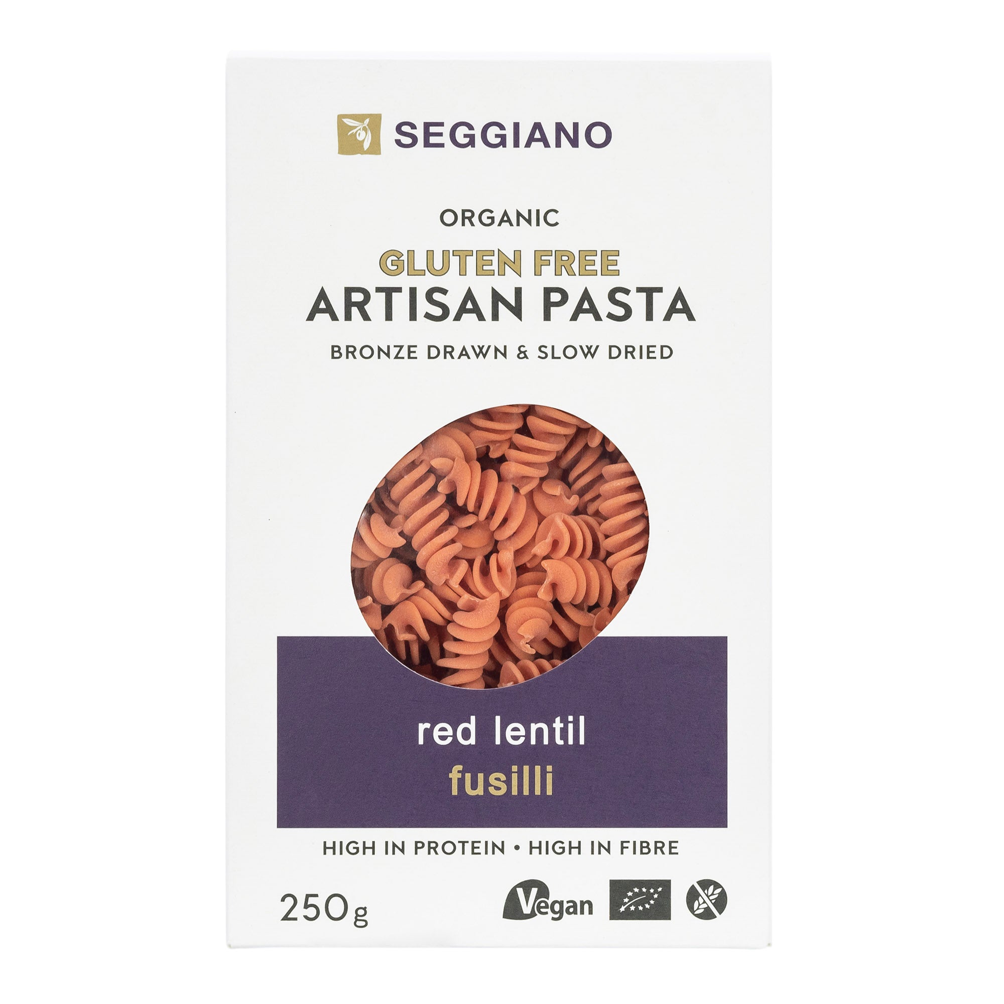 "Life's too short for eating legume pasta with a dull flavour and stodgy consistency. the Seggiano found that only pasta crafted in the artisan tradition of bronze forming and slow drying at low temperature delivers the flavour and consistency worthy of a gourmet gluten free meal for all the family. This Seggiano gluten free organic pasta is made with 100% legume flour. Red lentil pasta is high in protein and fibre, with a good consistency and delicious flavour. It can be enjoyed simply with just a drizzle of excellent extra virgin olive oil. Produced by a family business, using innovative combinations of corn, rice, buckwheat, legumes, quinoa & teff, our certified gluten free pasta range offers interesting nutritional variety and digestibility with delicious flavour. "