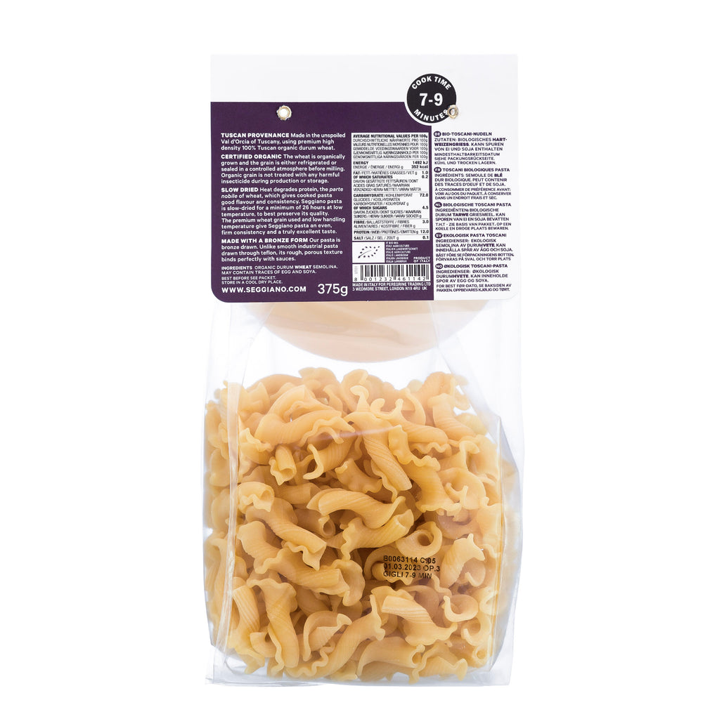 "Made from a certified organic Tuscan wheat, the pasta is slow dried and formed using bronze moulds."