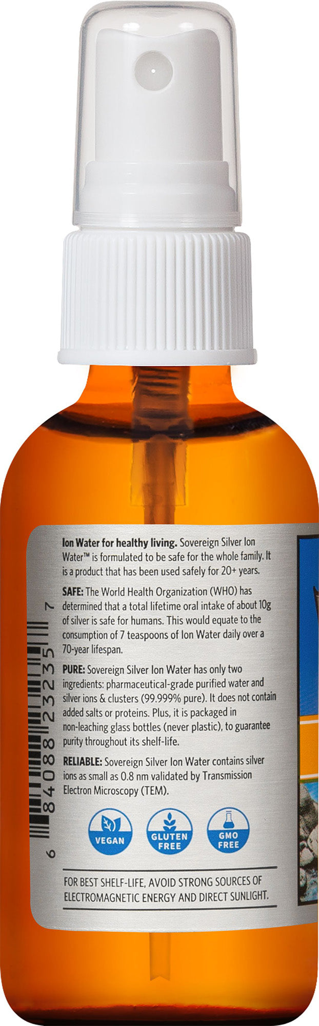 Notify Me When Available"Silver has a long history of safe use in a diverse range of applications in healthcare personal hygiene (including feminine douching) and water purification. Health sovereignty starts with you... In a world in which we have to power to rediscover nature’s solutions to our health challenges, Natural Immunogenics produce the finest mineral hydrosols and natural health products as the first line of defence in the journey to health sovereignty.Family-owned and leading the industry in the research and development of hydrosol products. The company operates out of its own custom, state-of-the-art, NSF GMP certified facility and laboratory.ION WATER WITH SUPER POSITIVELY CHARGED IONS - Ion Water for healthy living. Sovereign Silver Ion Water™ is formulated to be safe for the whole family. It is a product that has been used safely for 20+ years.SAFE - The World Health Organization (WHO) has determined that a total lifetime oral intake of about 10g of silver is safe for humans. This would equate to consuming 7 teaspoons of Ion Water daily over a 70-year lifespan.PURE - Sovereign Silver Ion Water has only two ingredients: pharmaceutical-grade purified water and silver ions & clusters (99.999% pure). It does not contain added salts or proteins. Plus, it is packaged in non-leaching glass bottles (never plastic), to guarantee purity throughout its shelf-life.RELIABLE - Sovereign Silver Ion Water contains silver ions as small as 0.8 nm validated by Transmission Electron Microscopy (TEM)."