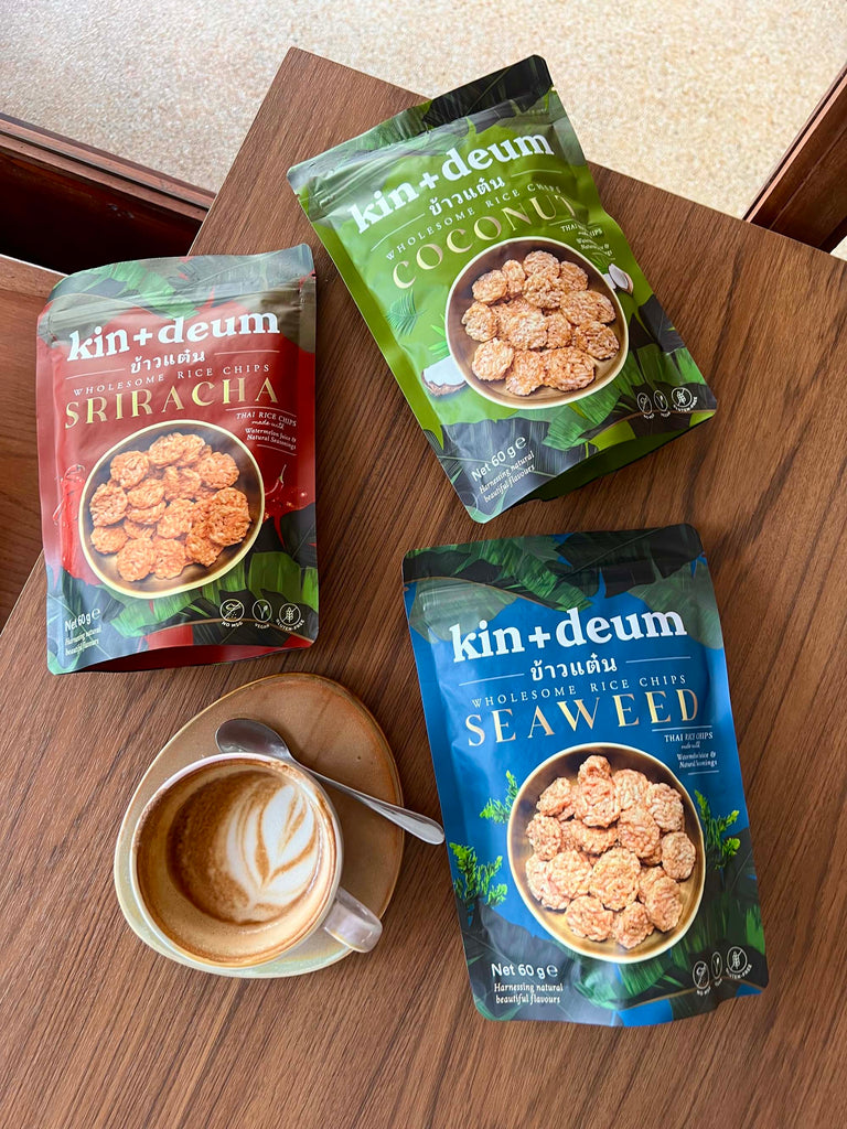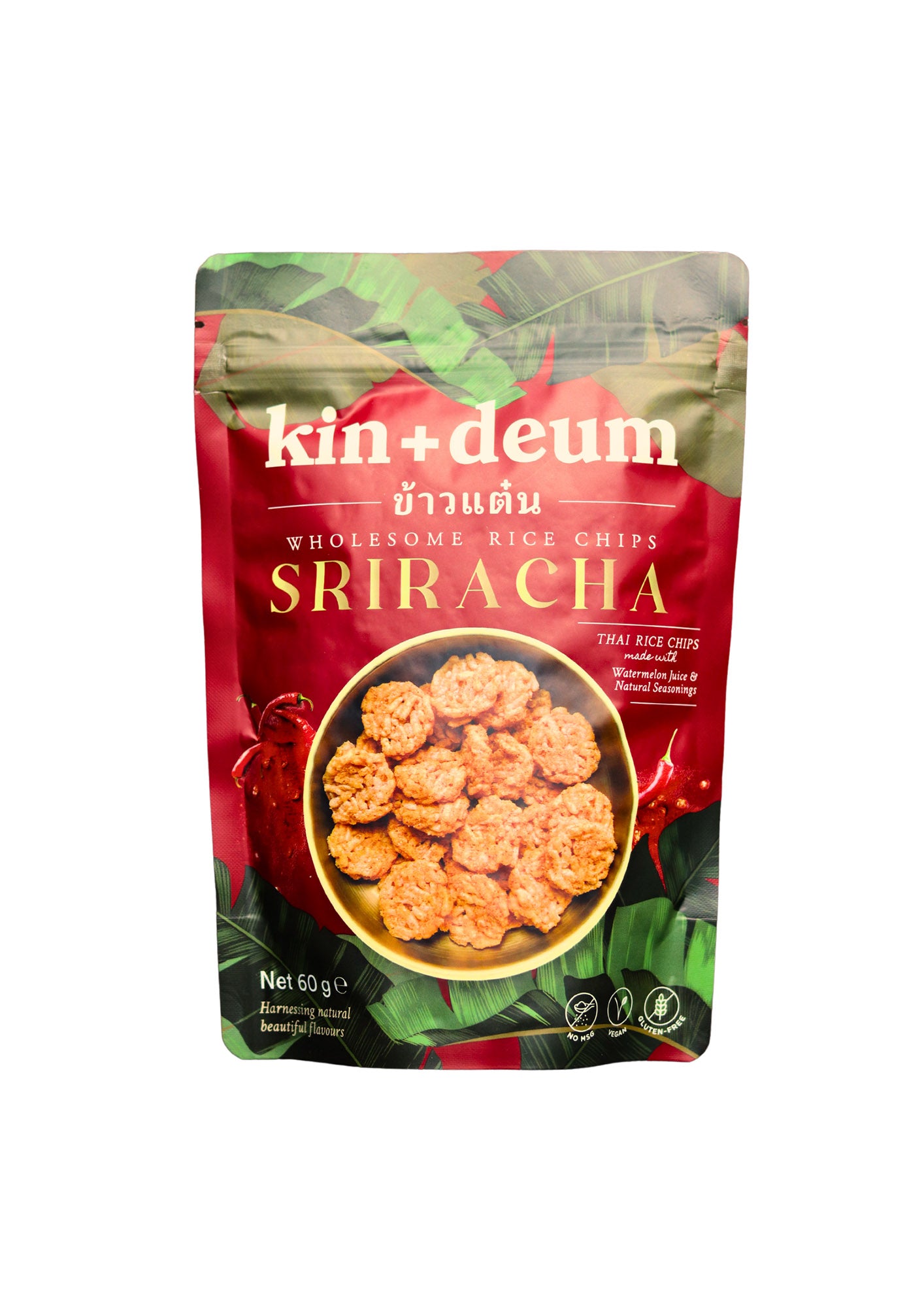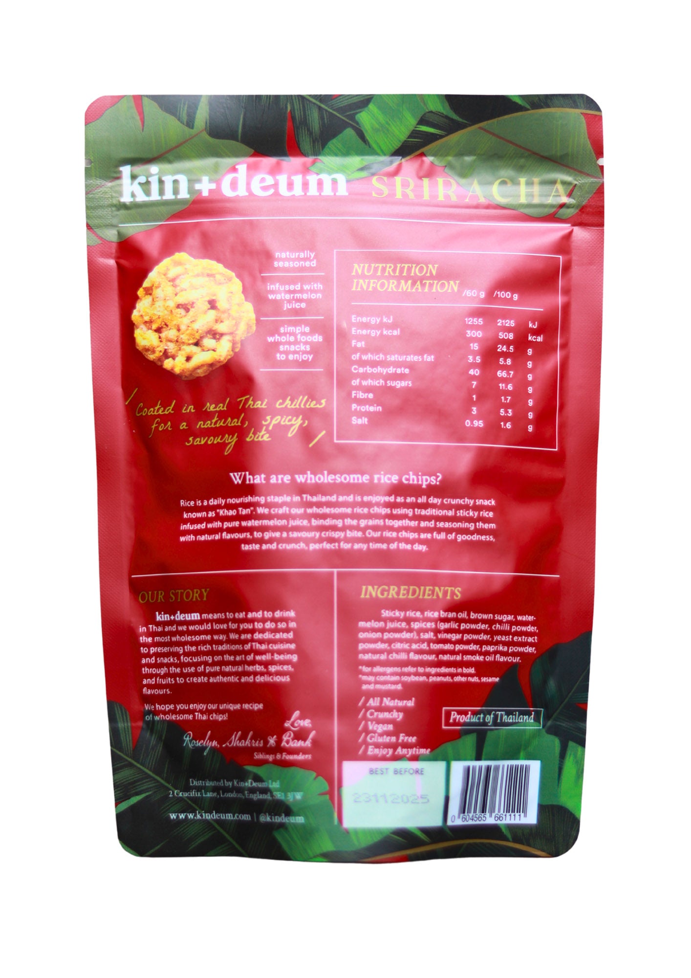 "Kin+Deum Sriracha Wholesome Rice Chips are a bold, fiery take on a classic Thai favourite. Made with sun-dried Thai chillies, this vibrant flavour packs a fiery, savoury crunch. Naturally seasoned with a blend of smoked spices, it delivers the perfect heat with every bite - intensely flavourful, never overpowering.Light, crisp, and full of character, these chips are gluten-free, vegan, and contain no MSG or artificial additives - crafted to satisfy spicy cravings the wholesome way."