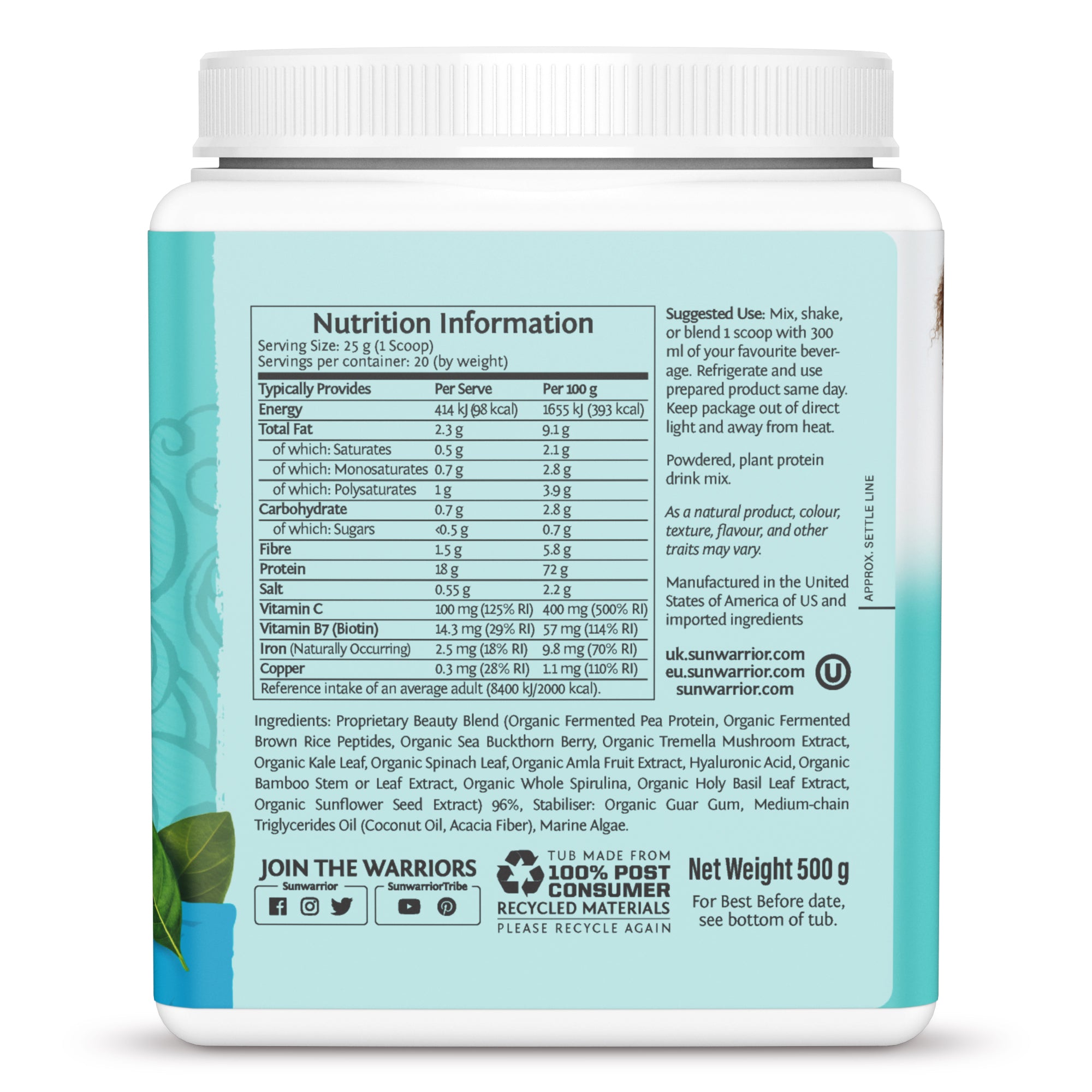 "Sunwarrior beauty-enhancing formula also contains strengthening and supporting nutrients such as vitamin C, trace minerals, leafy greens, silica, and biotin. Hydrating compounds such as hyaluronic acid and tremella mushroom extract attract and retain skin moisture. "