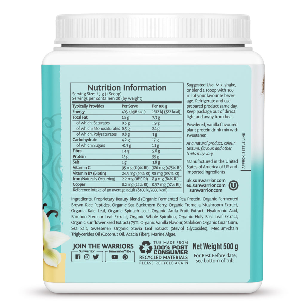 "Sunwarrior beauty-enhancing formula also contains strengthening and supporting nutrients such as vitamin C, trace minerals, leafy greens, silica, and biotin. Hydrating compounds such as hyaluronic acid and tremella mushroom extract attract and retain skin moisture. "