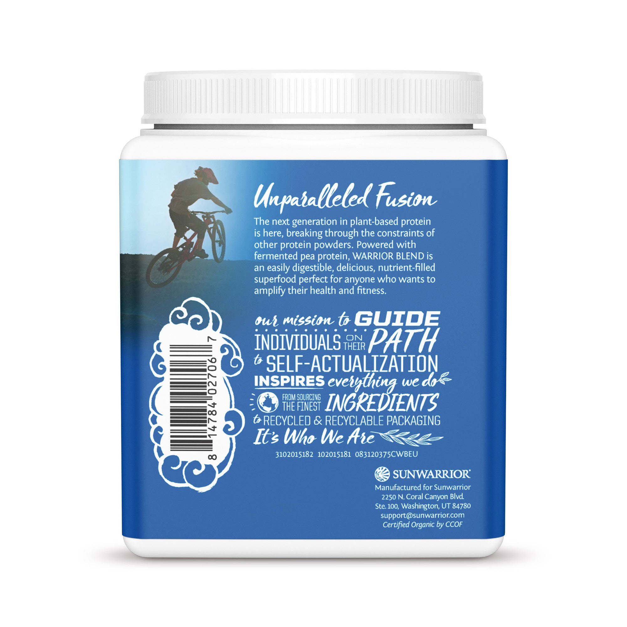 Notify Me When Available"SunWarrior’s Warrior Blend (Chocolate) fuses the synergistic power of several rich protein sources into a one smooth, great-tasting plant-based blend. Fermented yellow peas, goji berries and hemp seeds come together to supply a complete amino acid profile with a substantial amount of BCAAs (branch-chain amino acids). Enhanced with coconut MCTs (medium-chain triglycerides) to fuel your body and active lifestyle. Warrior Blend is a high-performance plant-based protein blend, designed for anyone who wants to amplify their health and fitness. Certified organic ingredients provide a clean source of nutrients. Low in carbs, free from added sugars, and keto-friendly. Protein helps to build and maintain lean muscle mass. Deliciously smooth chocolate flavour containing organic cocoa. Also available in Vanilla, Berry, Mocha, Maple French Toast and Unflavoured.Key Features: High performance, Synergy of nutrient-dense ingredients, MCTs from organic coconuts, Certified Organic EU/USDA, 16g protein per serving, 4g BCAAs per serving, Clean protein ingredients, Fuel for active lifestyle, Pre- and post-workout, Low glycaemic index (1.1 carbs, 98 calories per 25g serving), Satiating and great tasting, Smooth texture, Keto-friendly • Supports muscle maintenance, Source of iron, Easy on the digestion (fermented pea for bioavailability), No added sugars, Free from artificial ingredients or chemicals, Hypo-allergenic: Dairy, Gluten and Soya Free, Vegan, Kosher, Non -GMO, Eco-friendly (Tub is made from 100% Post consumer recyclable materials)"