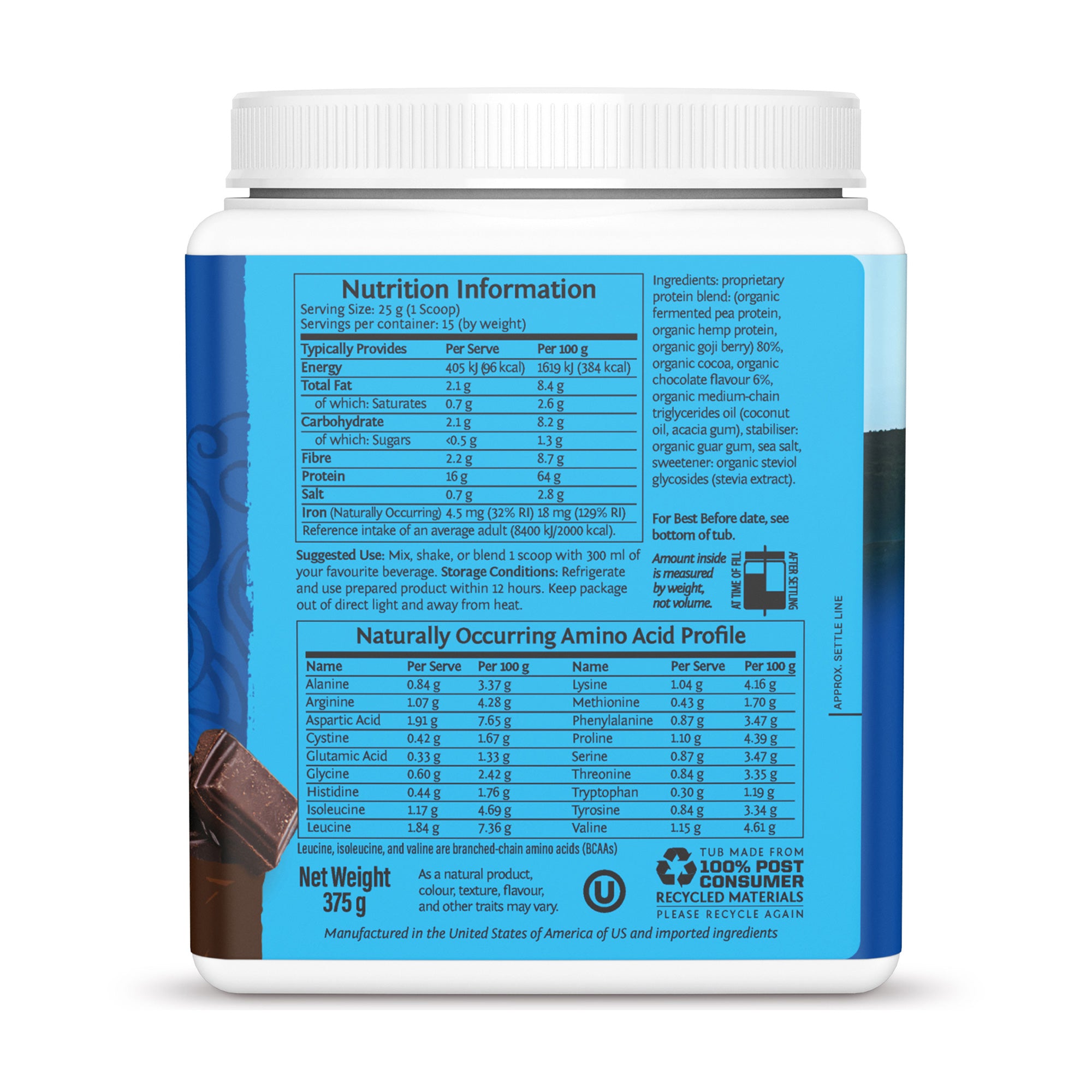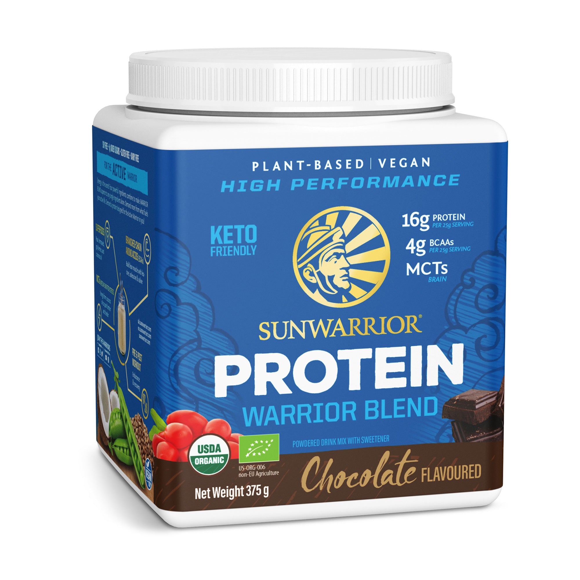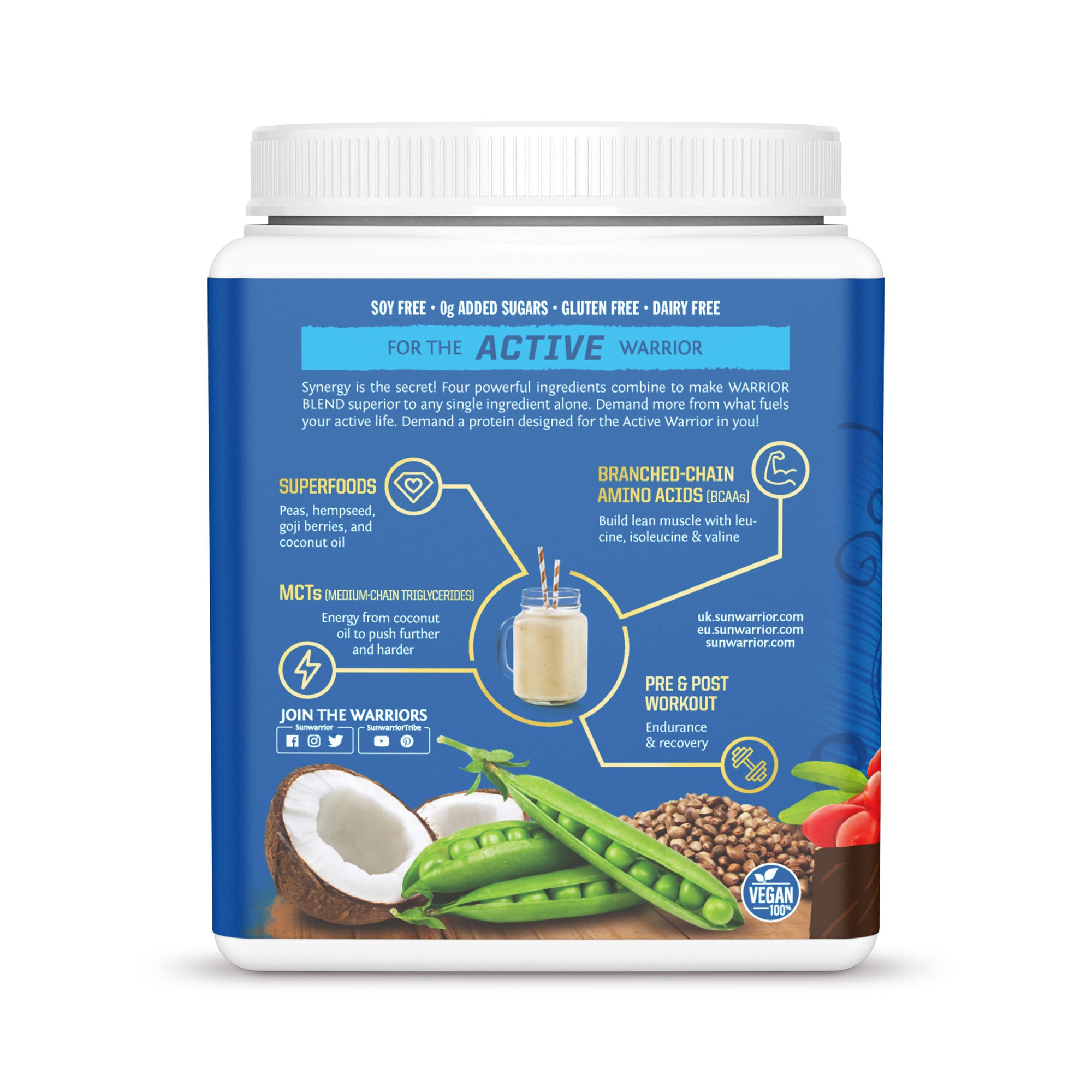 "SunWarrior’s Warrior Blend (Chocolate) fuses the synergistic power of several rich protein sources into a one smooth, great-tasting plant-based blend. Fermented yellow peas, goji berries and hemp seeds come together to supply a complete amino acid profile with a substantial amount of BCAAs (branch-chain amino acids). Enhanced with coconut MCTs (medium-chain triglycerides) to fuel your body and active lifestyle. Warrior Blend is a high-performance plant-based protein blend, designed for anyone who wants to amplify their health and fitness. Certified organic ingredients provide a clean source of nutrients. Low in carbs, free from added sugars, and keto-friendly. Protein helps to build and maintain lean muscle mass. Deliciously smooth chocolate flavour containing organic cocoa. Also available in Vanilla, Berry, Mocha, Maple French Toast and Unflavoured.Key Features: High performance, Synergy of nutrient-dense ingredients, MCTs from organic coconuts, Certified Organic EU/USDA, 16g protein per serving, 4g BCAAs per serving, Clean protein ingredients, Fuel for active lifestyle, Pre- and post-workout, Low glycaemic index (1.1 carbs, 98 calories per 25g serving), Satiating and great tasting, Smooth texture, Keto-friendly • Supports muscle maintenance, Source of iron, Easy on the digestion (fermented pea for bioavailability), No added sugars, Free from artificial ingredients or chemicals, Hypo-allergenic: Dairy, Gluten and Soya Free, Vegan, Kosher, Non -GMO, Eco-friendly (Tub is made from 100% Post consumer recyclable materials)"