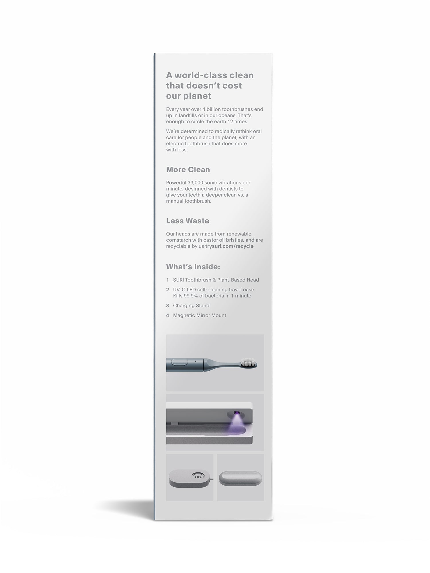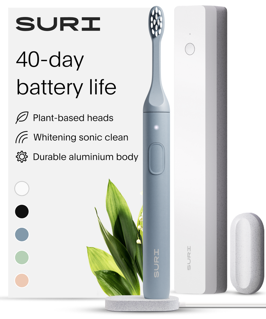 SURI believes our daily rituals should be in harmony with our planet. SURI’s electric toothbrush uses recyclable plant-based heads and bristles, while the slim aluminium body features a thoughtful design for long-lasting performance