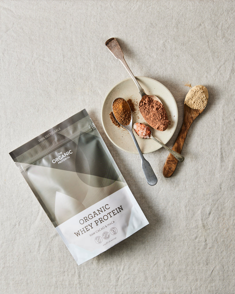 "The Organic Protein Co. Raw Cacao & Maca Organic Whey Protein is made using whey protein from organic grass fed cow’s milk, raw organic cacao, raw organic maca, a dash of unrefined organic coconut sugar and a sprinkle of Himalayan pink salt. They've used real organic whole foods with no additives, resulting in an exquisite creamy chocolate taste. Simply mix with water or milk for a very yummy protein drink."