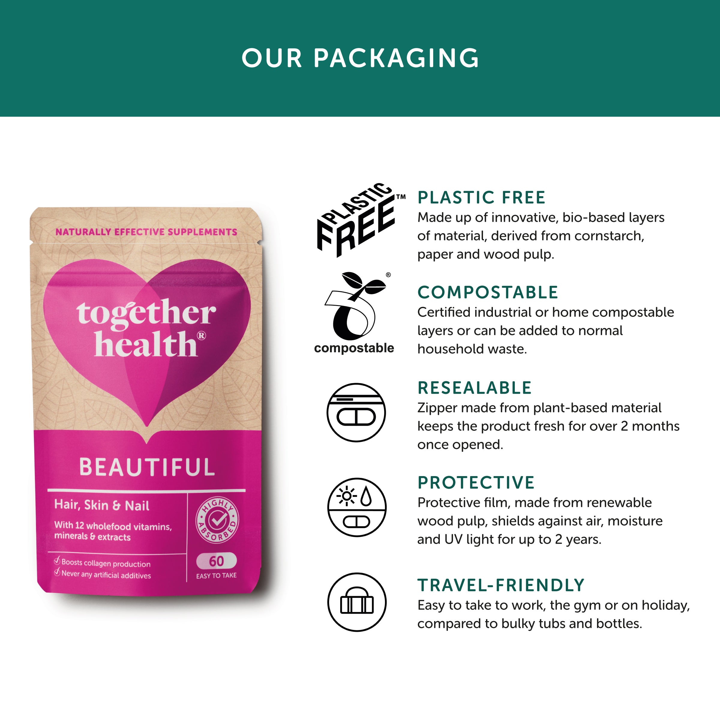 "Together have created an inner beauty supplement to make you look and feel that little bit extra special. Along with all the benefits of their much loved food based vitamins and minerals, they have carefully selected a combination of natural, glow giving nutrients to enrich your hair, skin and nails. Using whole food ingredients Together have created vitamins and minerals that are easily absorbed and gentle on the stomach. The capsules are packed with collagen-boosting nutrients vitamin C and hyaluronic acid as well as nutrients specially targeted to support hair, skin and nail health. These include riboflavin, niacin and biotin which contribute to the maintenance of normal skin. Plus minerals selenium and zinc which contribute to the maintenance of normal hair and nails. We also include natural slilica from bamboo extract (which is, incidentally, the richest known source). Key Highlights: 10 beauty specific food based vitamins and minerals Contains essential naturally occurring food cofactors Complete with collagen boosting hyaluronic acid Richest source of natural silica from bamboo extract All ingredients free from pesticides and herbicides Tested safe for heavy metals Free from WHEAT, ACTIVE YEAST, GLUTEN, SOYA Free from MILK products (LACTOSE) Non GMO Pregnancy safe Gentle on the stomach Manufactured to ISO / GMP / BRC accreditation"