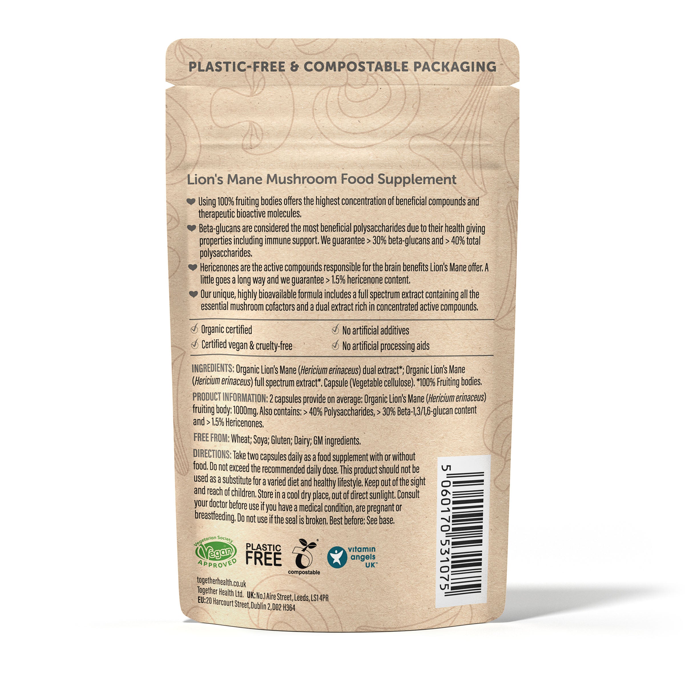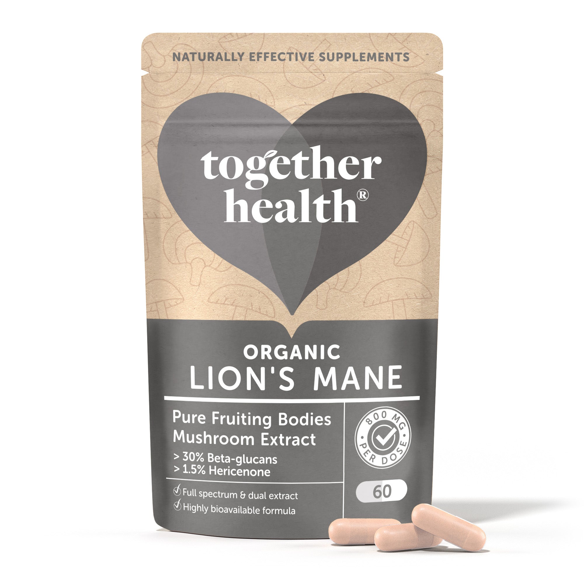 "Lion's Mane mushrooms are known for their health benefits, including supporting cognitive function and the immune system. Together Health's Lion's Mane Mushroom supplement captures these benefits in a convenient form. Made with 100% fruiting bodies of Lion's Mane mushroom, this supplement offers a unique, highly bioavailable formula that includes a full spectrum extract and a dual extract. This combination ensures the presence of all the essential mushroom cofactors for maximum effectiveness. Together Health guarantees that the supplement contains total 40% polysaccharides, 30% beta-glucans, and 1.5% hericenone content. Certified organic, vegan, and cruelty-free, and devoid of artificial additives and processing aids, this supplement is a natural partner for a healthier lifestyle. Boost your wellbeing with Together Health's Lion's Mane Mushroom Food Supplement."