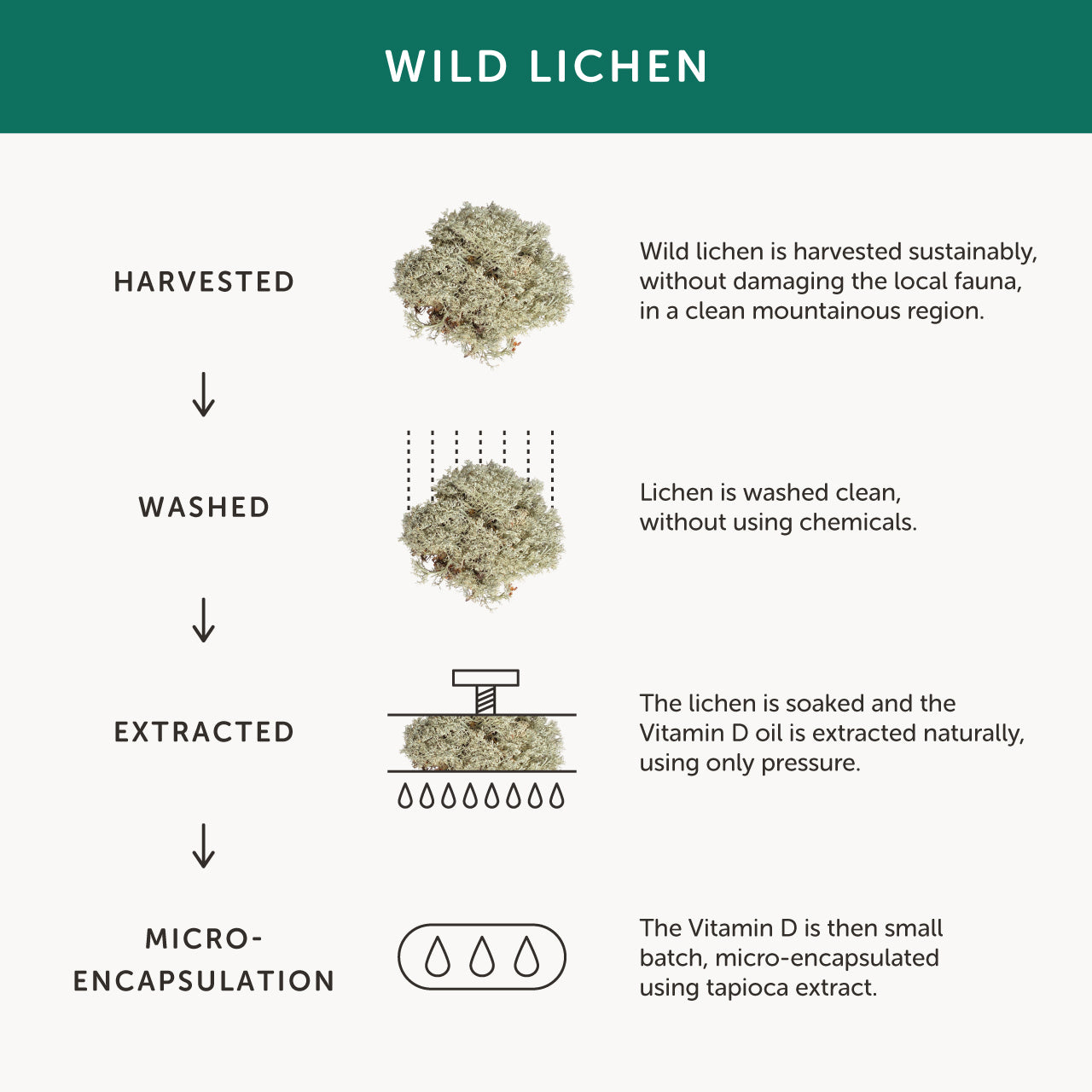 "Together's plant based, vegan vitamin D3 comes from lichen, the only plant source of the body’s preferred active form of this vitamin. The lichen is grown using sustainable practices in the fresh air of remote mountain regions. They have also included coc"