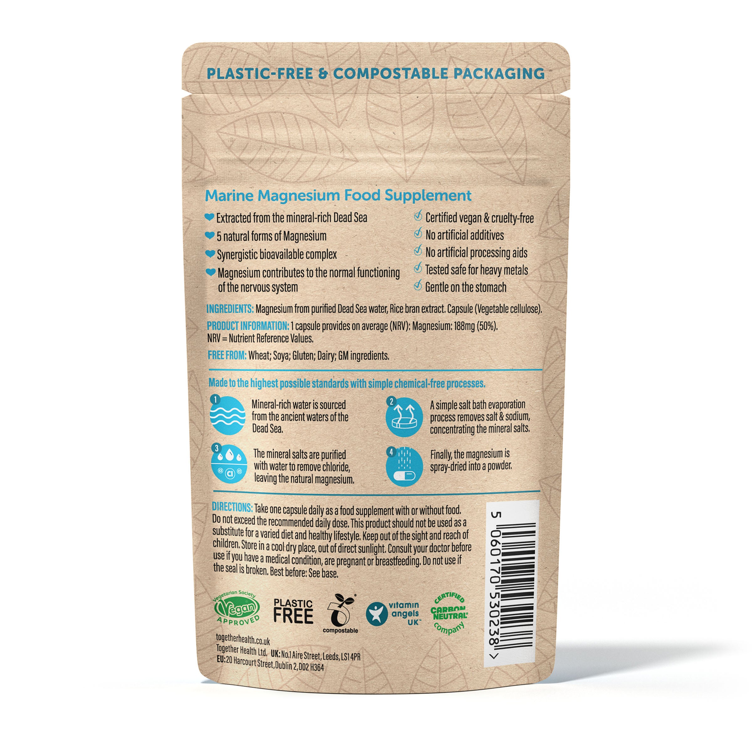 Together have taken all the goodness from one of Nature's purest offerings and sourced our magnesium from the salty waters of the Mediterranean Sea. Together believe our bodies better understand and more readily absorb minerals taken from natural sources compared with more synthetic means. Each capsule provides on average (Recommended Daily Allowance.) Magnesium: 188mg (50%). and comes packaged in a handy re-sealable pouch. This product does not contain wheat; yeast; gluten; milk products (lactose); added sugars; chemicals; additives; colourings; flavourings; preservatives and GM ingredients.