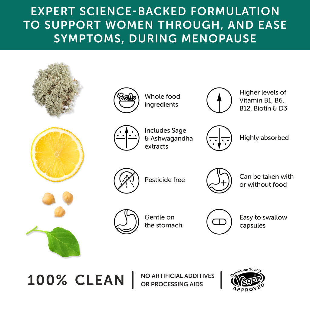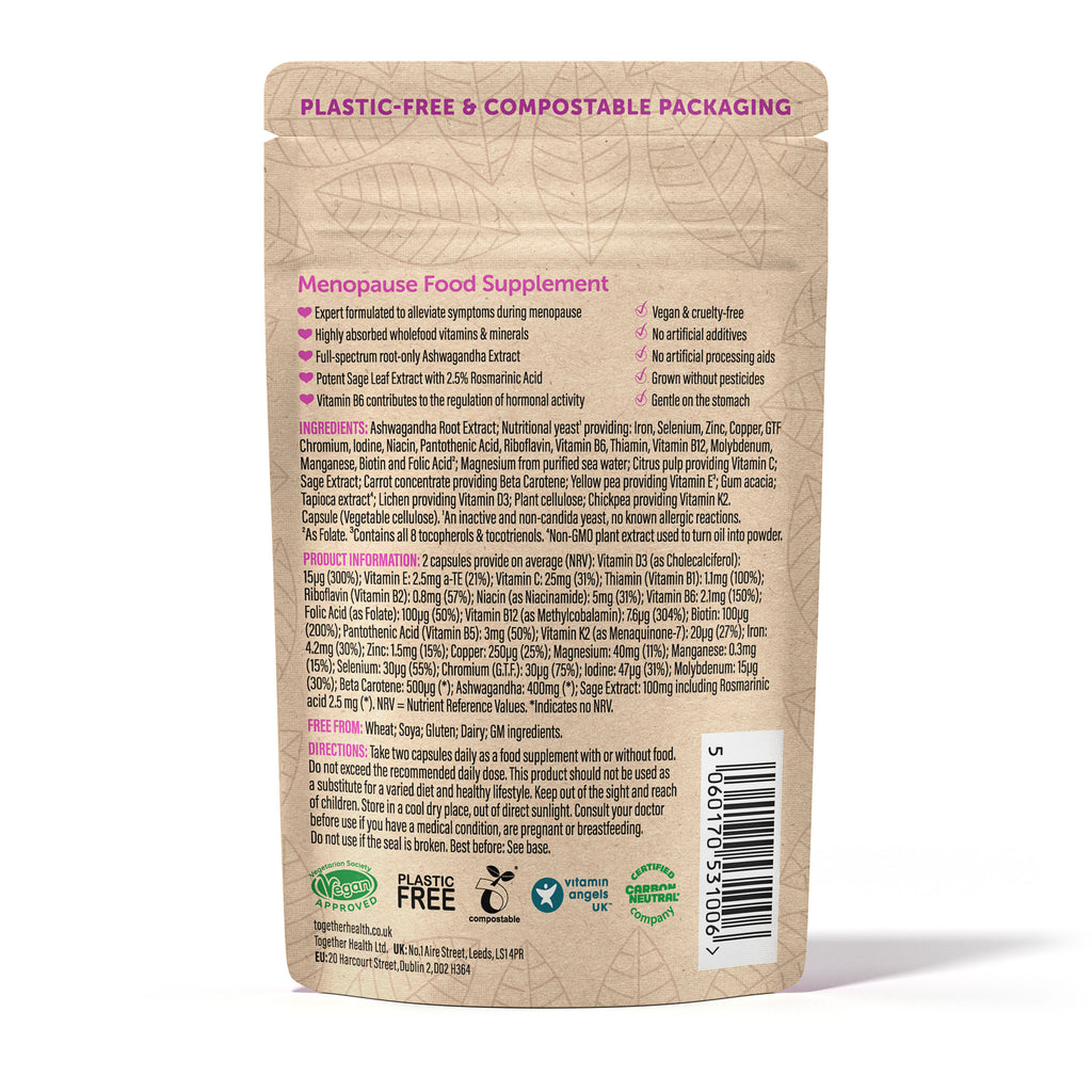 "Together's Menopause formula includes 22 wholefood vitamins and minerals, as well as two potent herbal extracts, all carefully selected, and each playing an important role in supporting the body during the menopause. This comprehensive approach targets each symptom that can arise before, during and after the menopause. Together's food-based nutrients are raw and complete. Using carefully controlled low-heat conditions, they preserve all the naturally occurring goodness found in fresh foods, like live enzymes and phytonutrients, amino acids, trace minerals and other bioactive co-factors. The body recognises the nutrients as food, making them easily absorbed and more effective than synthetic isolated nutrients. No artificial additives or processing aids."