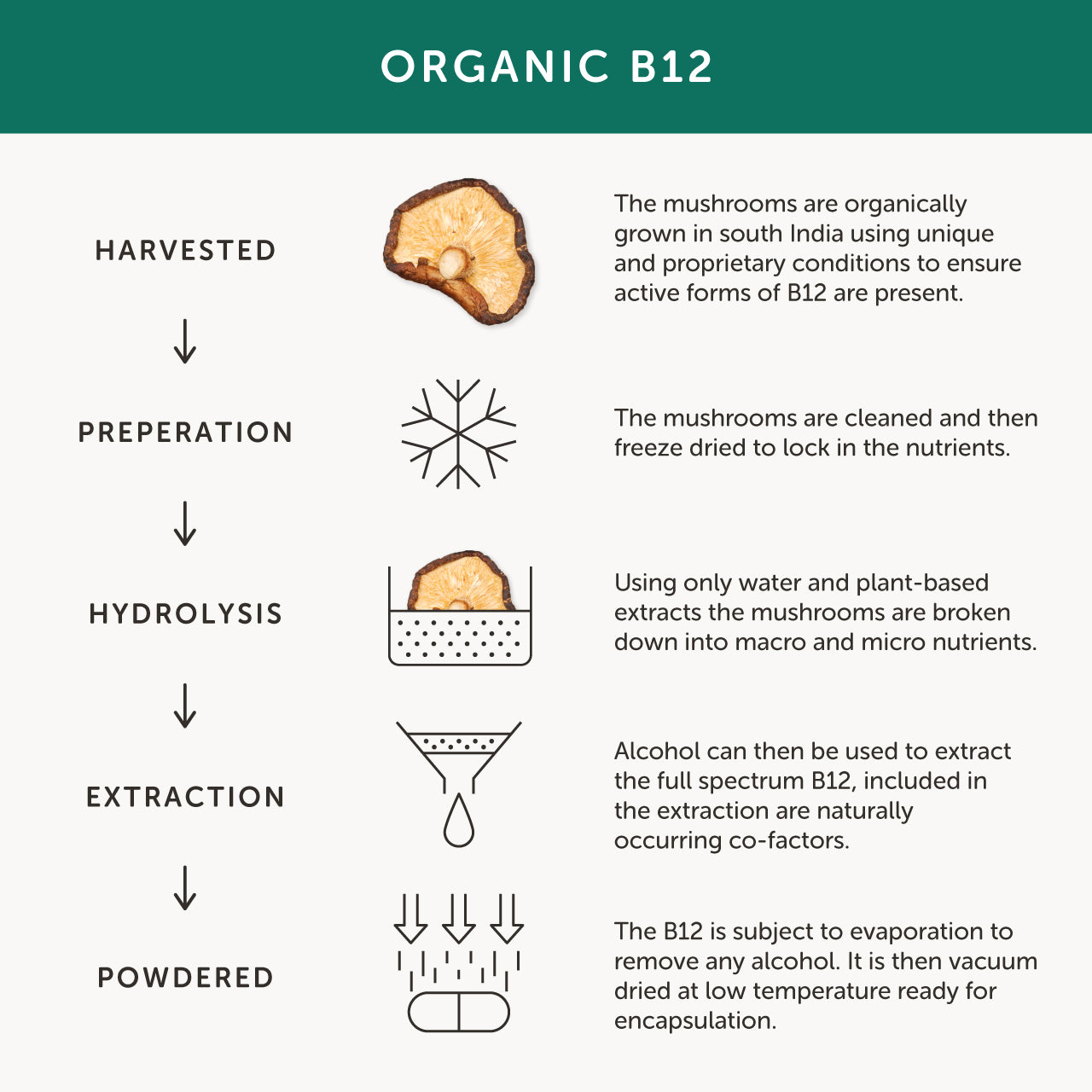 "Together's vegan, wholefood vitamin B12 is made from organic Shiitake mushrooms and contains three natural, active and preferred forms of B12: Methylcobalamin, Adenosylcobalaminare & hydroxylcobalamin."