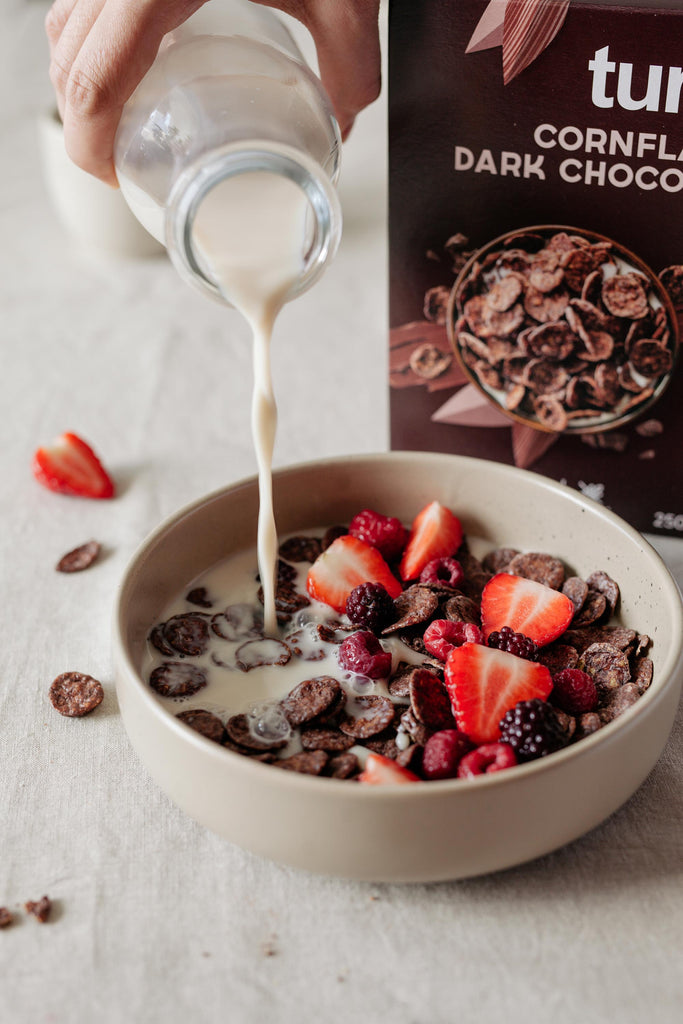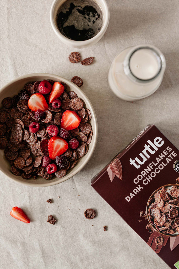"Turtle Cornflakes Dark Chocolate: our amazing, gluten-free, vegan, and organic breakfast cereal that's not only delicious but also the proud recipient of 2 stars at the Great Taste Awards. These cornflakes are coated in rich dark chocolate, offering a crunchy texture that remains intact even in milk. Indulge in a guilt-free morning treat that combines the goodness of organic ingredients with the decadence of dark chocolate"