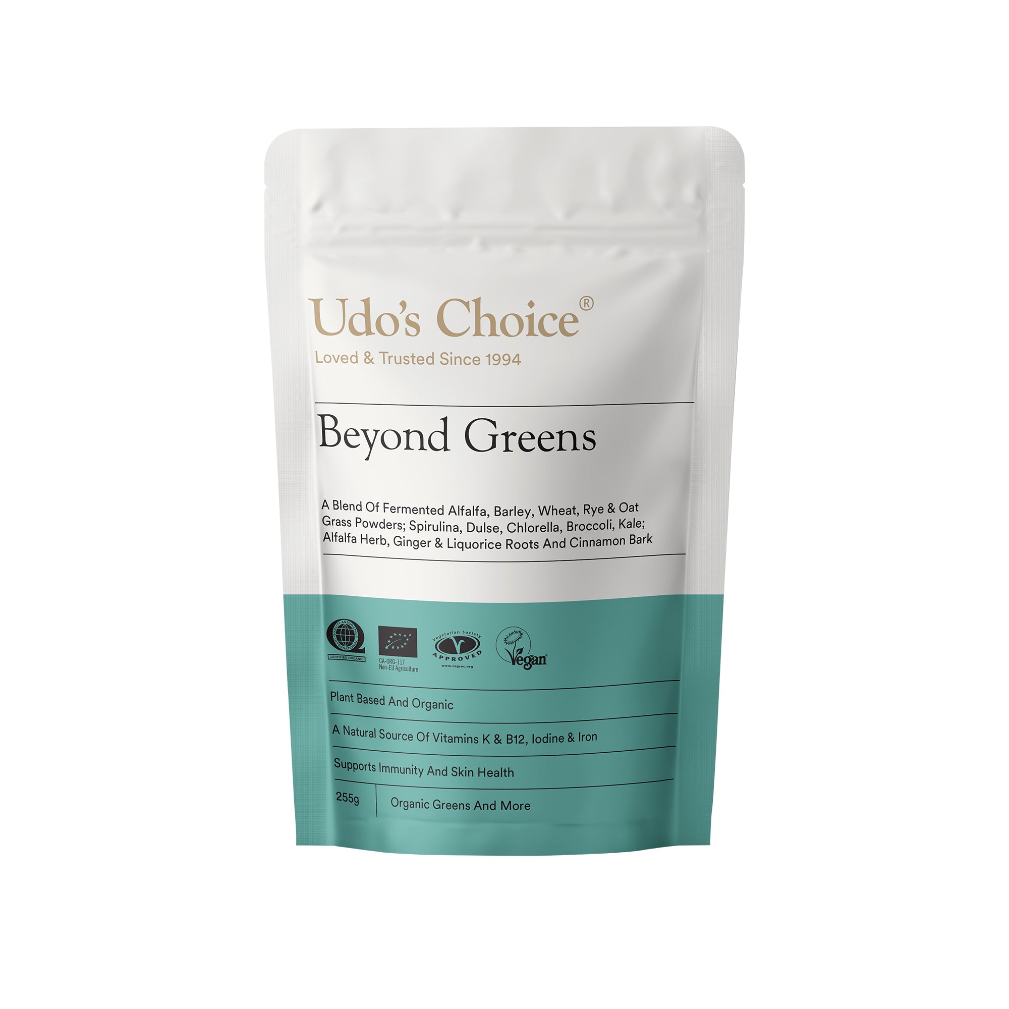 "Udo’s Choice Beyond GreensA vitalising blend of certified organic vegetables and vegan fermented greens, the Beyond Greens is a source of naturally occurring vitamin B12 and iodine to support energy, skin and the normal functioning of the immune system.Loved & trusted in the UK for over 20 years, Udo’s Choice Beyond Greens are the best & original. includes fermented grasses, green vegetables and the superfood algae & seaweeds of spirulina, dulse and chlorella. A variety of digestive herbs such as alfalfa herb, ginger root, cinnamon bark and liquorice root have been added, as well as fibre from flax, sunflower and sesame seeds.Contains fermented grasses which act like ‘pre-digestion'. The 'good' bacteria help break down the fibrous cell walls of the greens and vegetables leading to less chance of indigestion, gas and bloating as well as better bioavailability of nutrients.A rich in phytonutrients & food sourced antioxidants, B12, Vitamin K, iron and iodineGreens are the basic foundation of health and are an excellent source of antioxidants.Beyond Greens can be taken with water, in a smoothie or in bakingAbout Udo's ChoiceYour health journey starts here.The Udo’s Choice range was developed by industry pioneer Dr. Udo Erasmus to tackle the most neglected areas of everyday nutrition - gut and cellular health. By consistently looking after these areas everything else falls into place.These are the foundations of health."