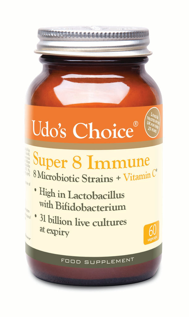 "Udos Choice Super 8 Immune contains eight microbiotic strains of Lactobacillus and Bifidobacteria, specifically designed to reach the gut alive, with added vitamin C for immune support.Poor diet or health, antibiotics, or simply the stresses and strains of modern living can disturb the delicate microfloral environment in the digestive tract, which can be detrimental to health in all kinds of ways.Udos Choice Super 8 Immune combats this by replenishing gut bacteria. It's one of the most efficient supplements of this type available. It contains eight bacteria strains found in both the small and large intestines, ensuring that your entire digestive system is covered.The strains used in Udos Choice Super 8 Immune have been specially chosen for their value to upper bowel health and formulated to the appropriate viable count.Rebalancing with Super 8 is faster and cheaper than microbiotic yoghurts and is sugar-free too. To look after yourself, start by looking after that incredible ecosystem in your digestive tract.Each vegetarian capsule contains 42 billion viable cells at the time of manufacture, in a base of potato starch, ascorbic acid, stearic acid and silicon dioxide.Preserved in amber bottles, Super 8 Immune guarantees premium ingredients with no FOS (which can create excessive bloating) and no unnecessary fillers or artificial ingredients.Loved and trusted in the UK since 1994At least 31 billion live cultures at expiryContains strains from both the Lactobacillus and Bifidobacterium with 91% of LactobacilliVitamin C contributes to the normal function of the immune systemFOS-free; no unnecessary fillers or artificial ingredientsTested to survive gut acidity - no need for enteric coatingSustainable, protective packagingGluten-freeSuitable for VegetariansThe Udos Choice range of Microbiotics provides the whole family with bacteria for their gut. From newborn babies to parents and grandparents, there is an Udo Erasmus formula to support your digestive health.About Udos ChoiceUdos Choice was developed by Dr Udo Erasmus, an industry expert in healthy fats and nutrition.With over 30 years of experience and dedication to health education and production excellence, Udos Choice has one mission - to provide customers with the best and most effective health support in the world.The Udos Choice range tackles four of the most neglected areas of nutrition in typical diets - essential healthy fats, greens, microbiotics and digestive enzymes."