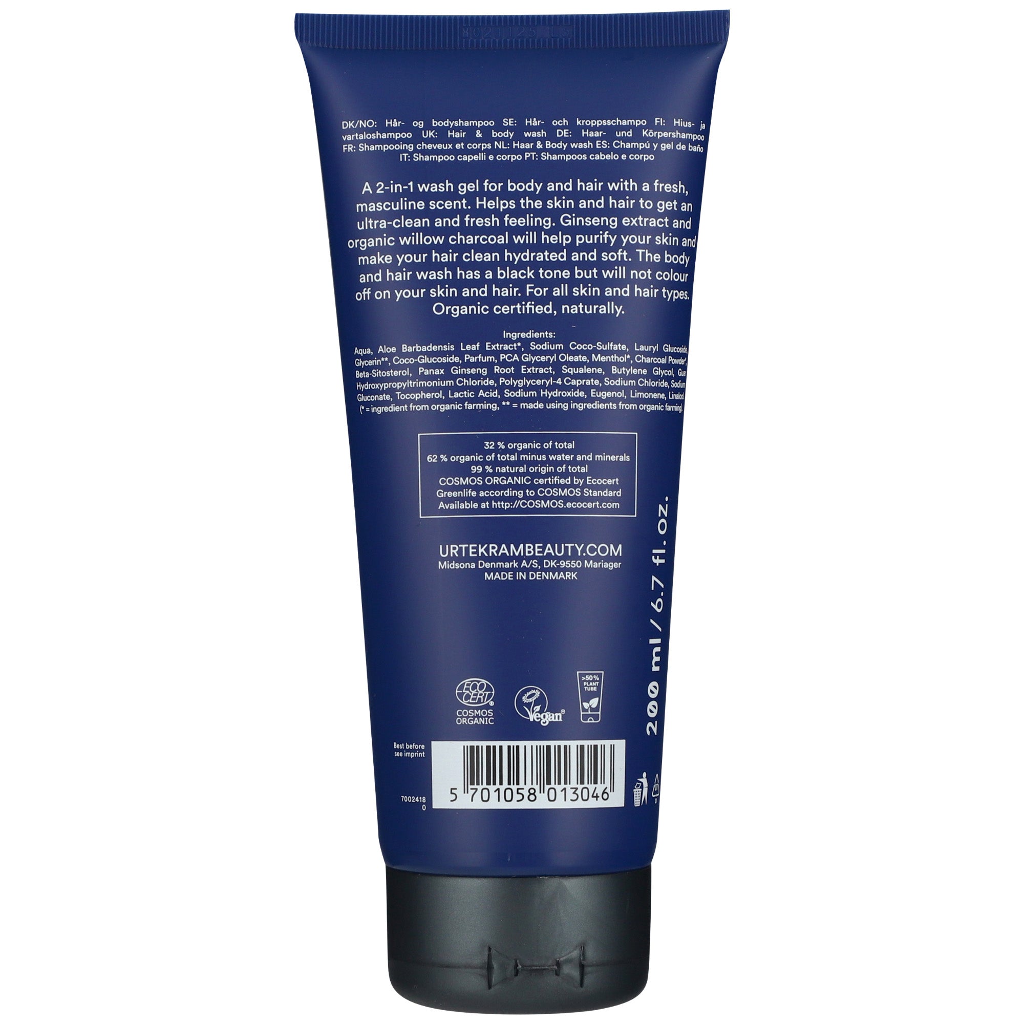 "2-in-1 Hair& Body WashWithginseng extractA 2-in-1 wash gel for body and hair with a fresh, masculine scent. Get an ultra clean and fresh feeling in body and hairGinseng extract + organic willow charcoal will help purify your skin and make your hair clean, hydrated and softBe quick and start your day with this refreshing hair & body wash. Due to the organic willow charcoal the product has a black tone but it will not colouroff on your skin and hair.For all skin and hair types."