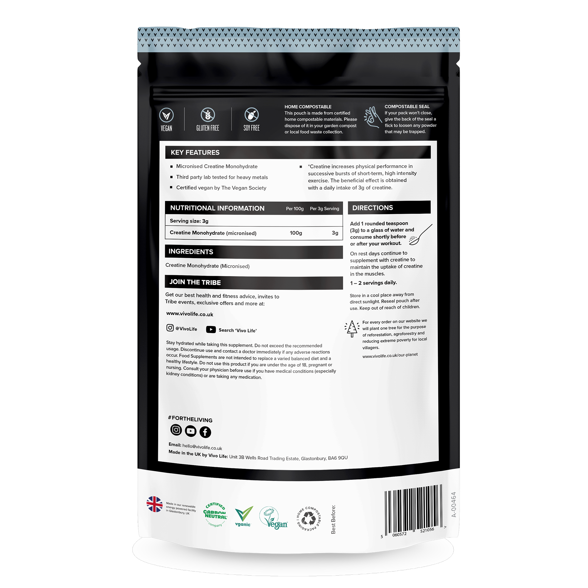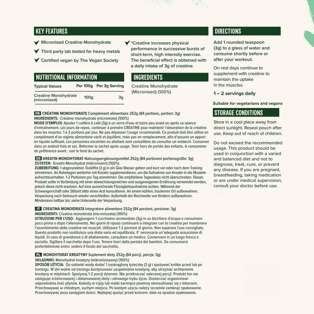 "Ultra-pure micronized creatine monohydrate- Creatine increases physical performance in successive bursts of short term, high intensity exercise- Certified by The Vegan Society- Third party tested for quality and purity"