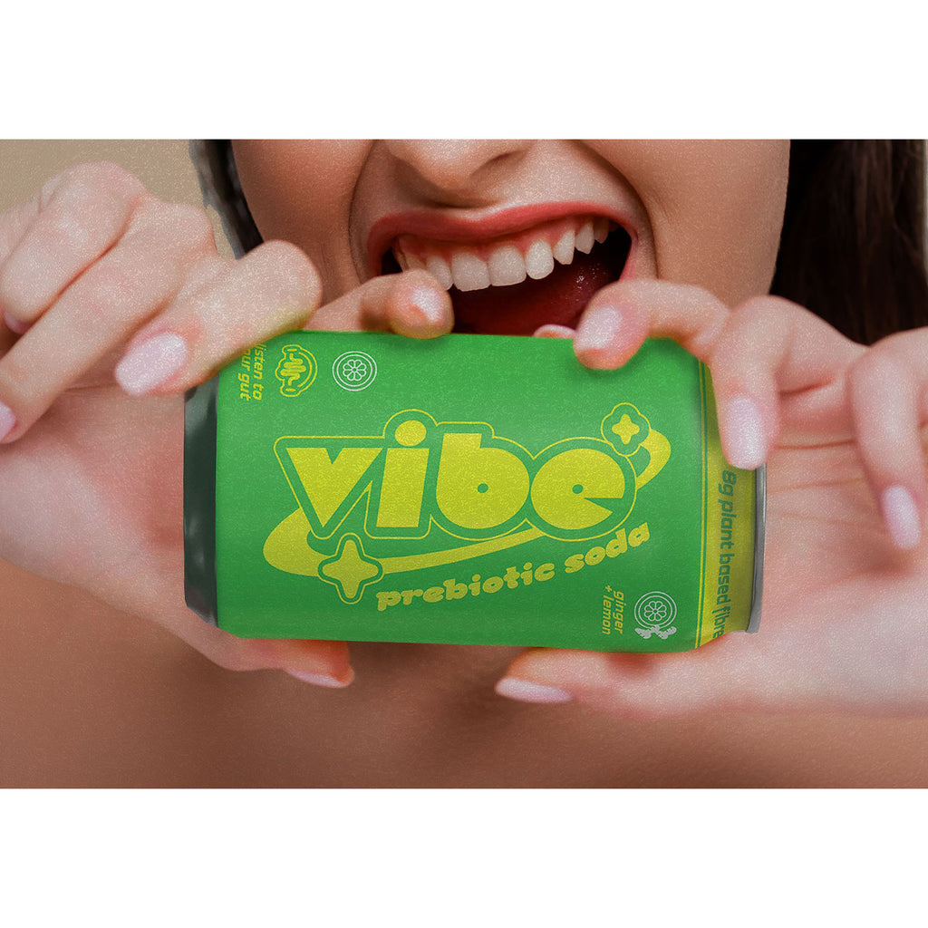 "Vibe’s prebiotic Ginger Lemon Soda, 8 grams of prebiotic fibre per can to help support your gut and immune system. Low sugar, Vegan, Gluten-free, and Delicious. This is Soda 2.0."