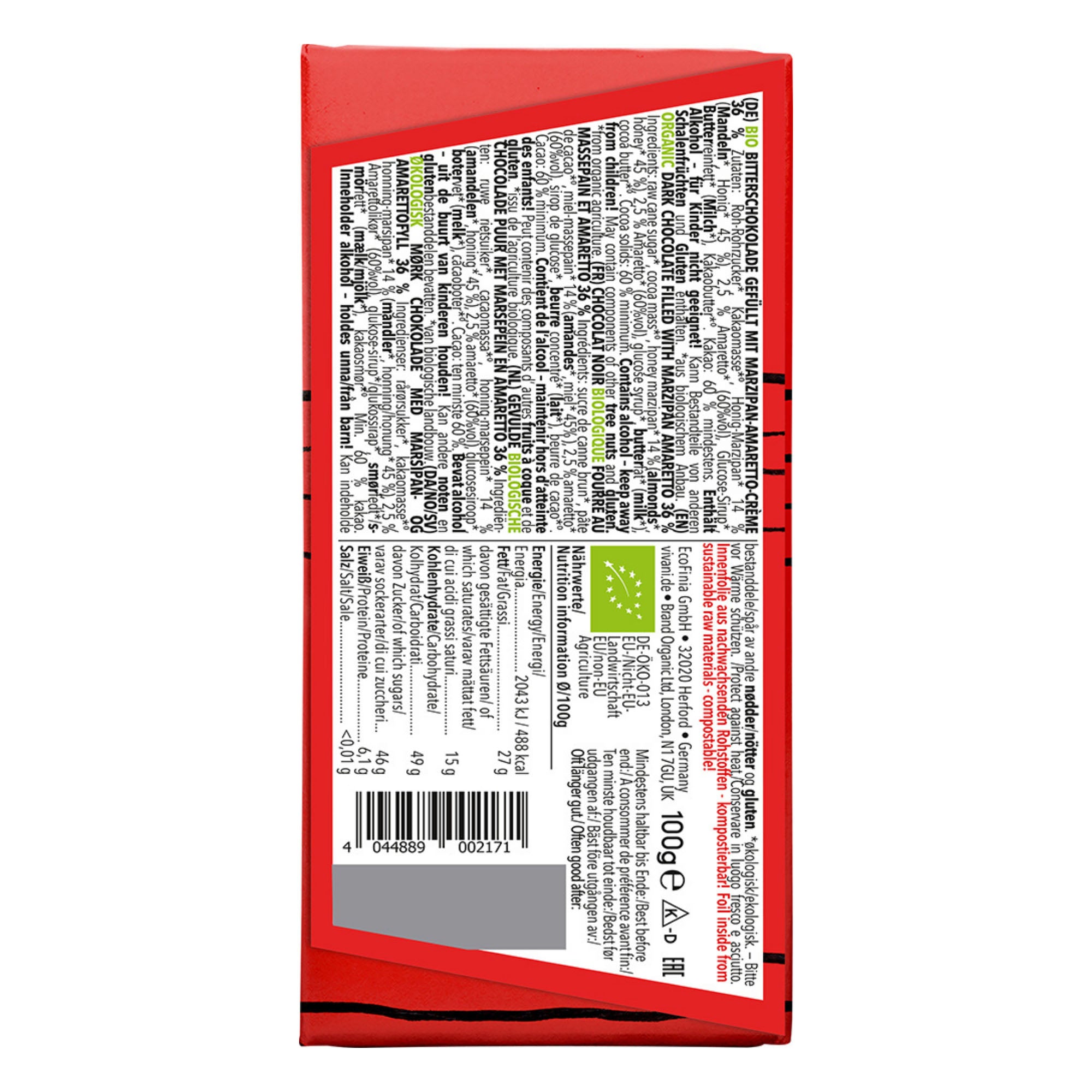 Organic fine dark chocolate with 60% cocoa filled with creamy, organic honey marzipan and an elegant touch of real Italian Amaretto. Home compostable inner packaging film based on cellulose. Contains alcohol - Not suitable for Children.