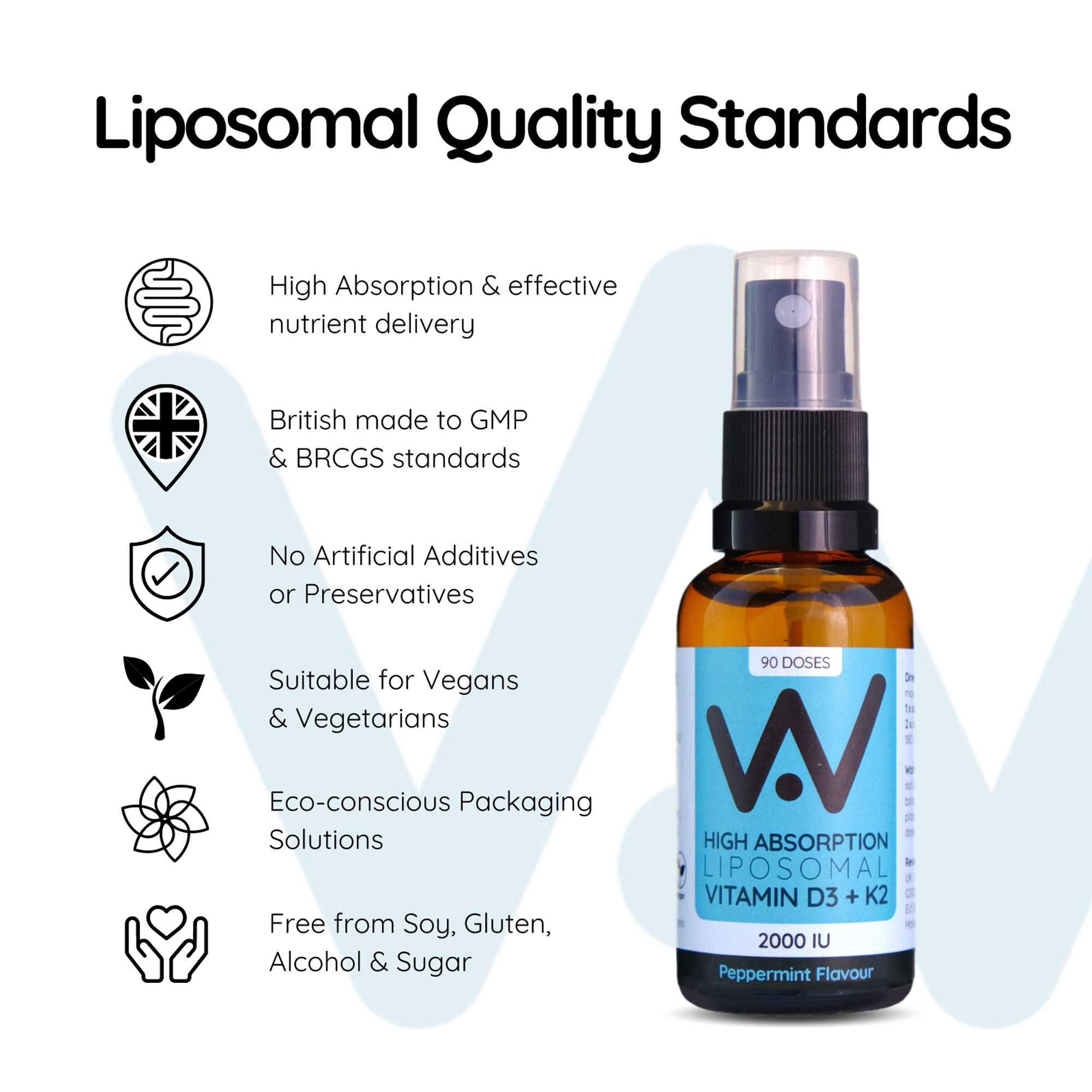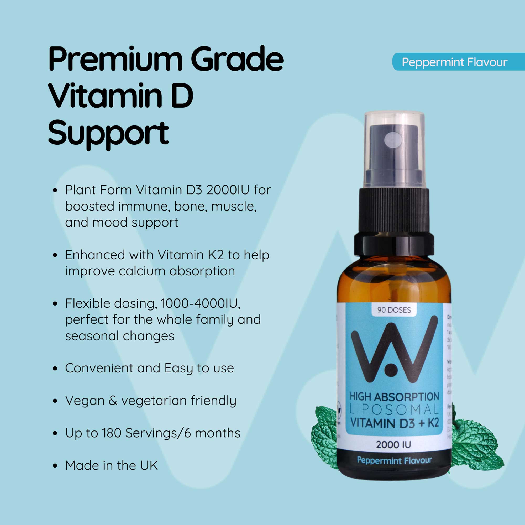 "Well.Actually. High Absorption, Liposomal Liquid Vitamin D3 (2000IU) + Vitamin K2 (100mcg), is in a convenient spray form that the whole family can enjoy in helping to support immune, bone & muscle health. In a delicious Peppermint flavour, just two spray pumps, delivers highly absorbable plant from Liposomal Vitamin D3 2000IU’s (90 servings), with one spray delivering 1000 IU’s (180 servings).Well.Actually.’s advanced liposomal delivery mechanisms, encapsulates it’s (plant form) Vitamin D3 + K2 within thousands of micro-phospholipid spheres (bubbles), which shields the nutrients from harsh digestive processes in the gut. The Sunflower Lecithin-derived Liposome membrane, is made of the same material structure as our own cell walls. The body recognises, rapidly absorbs, and transports the liposomes around the body, target-delivering the Vitamin D3 & K2 into cells for efficient and effective absorption."