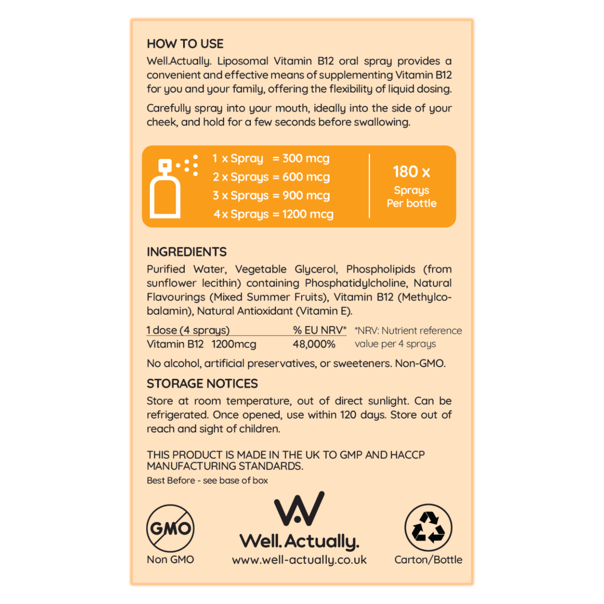 Well. Actually. Liposomal Vitamin B12 methylcobalamin Spray (1200mcg) - Truly Fruity Flavour 30ml