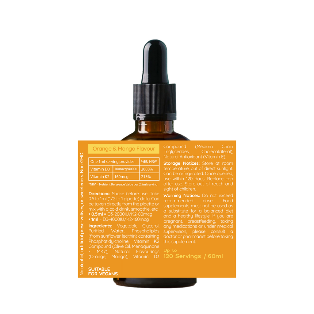 "Well.Actually High-Absorption Liposomal Liquid Vitamin D3 + K2, made in the UK. Each 60ml bottle offers 2000/4000IU D3, plus 80/160mcg K2 (Mk7) per D 1/2ml/1ml dose providing up to 120 servings, depending on your desired dose. Take it straight from the measuring pipette or mixing it with a cold drink, smoothie, or cereal."