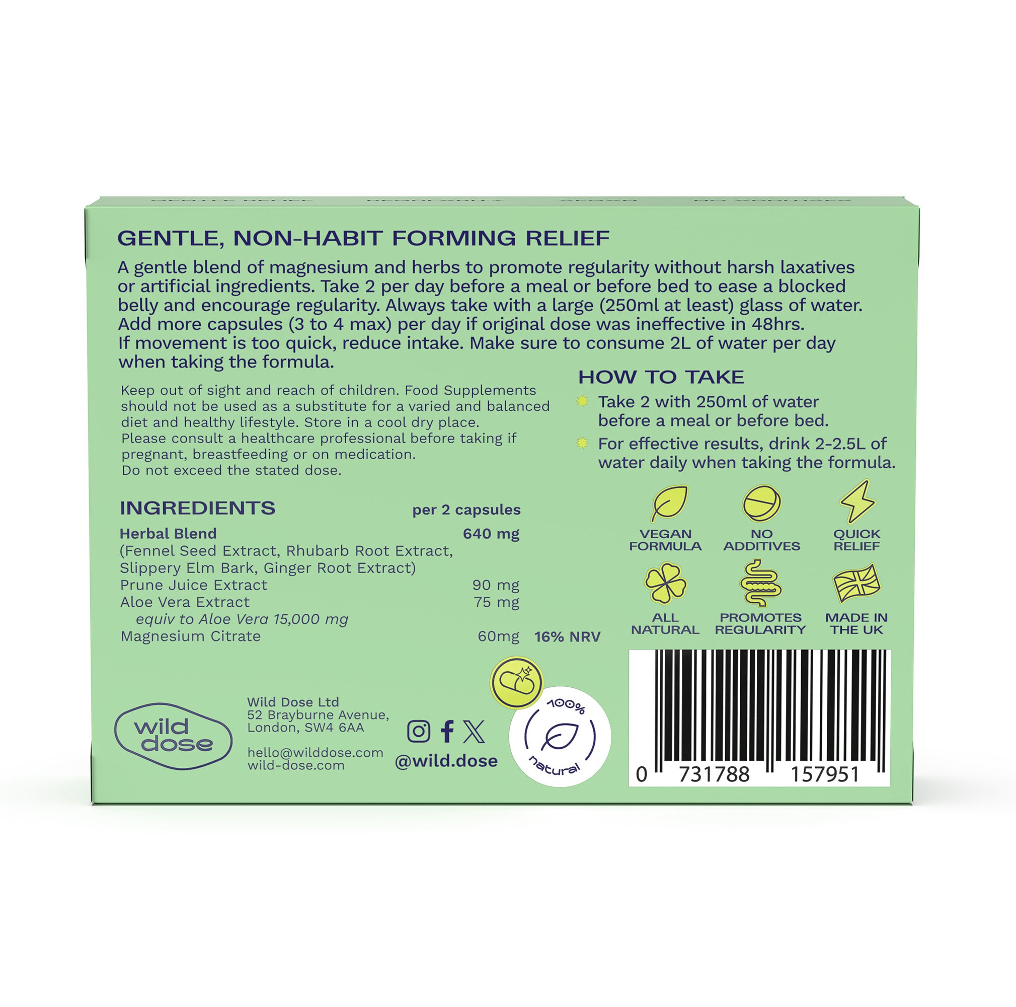 "Regularity is here without the uncomfortable side effects of laxatives.With no harsh laxatives, this formula gives overnight relief for regular and easy bowel movements - just with natural, vegan ingredients that are kind on your tum.Simply take two with a glass of water before bed + can be used daily!6 Herbs PLUS Magnesium - simple & natural."