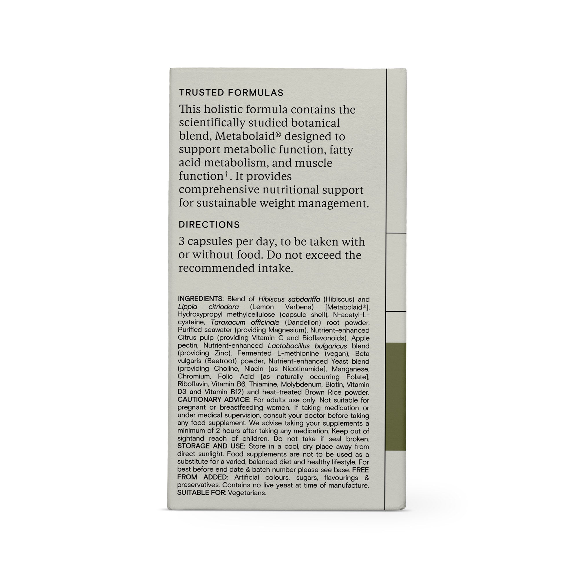 Meet UK first, Metabolaid® Our botanical blend is underpinned by decades of research, holistically supporting your weight transition, without the muscle loss. Empowering your journey Combining Vitamin B6 for hormonal balance and Vitamins B2 and B12 for lasting energy support and sustainable results. Harmony inside + out Breakthrough Metabolaid® supports both metabolic and microbiome health, while Vitamin C, Biotin and Niacinamide provide skin support.