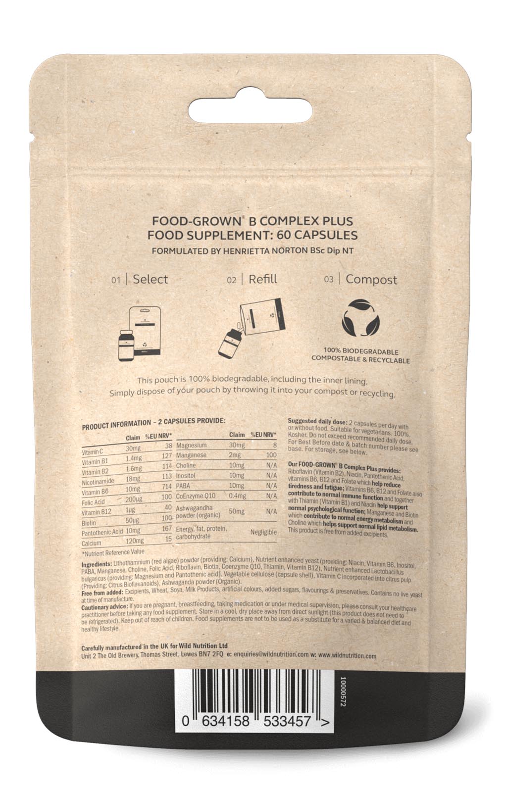 Notify Me When Available"Wild Nutrition Food-Grown® B Complex Plus is a sophisticated blend of Food-Grown® nutrients and botanicals to support your energy needs and resistance to stress. During times of stress your body’s demand for B vitamins and minerals such as magnesium can increase rapidly. Ensuring a sufficient supply of these key nutrients can support the nervous system, immune system and energy factories to ‘weather the storm’ more effectively. This is an excellent partner with Wild Nutrition Daily Multi Nutrients when life is particularly demanding. This bespoke formula contains clinically proven nutrients such as Vitamin B6 and B12 that contribute to the reduction of tiredness and fatigue, promote normal immune function and mental performance. The addition of vitamin C and magnesium support the protection of cells from oxidative stress as well as a healthy nervous system.This comprehensive formula also contains Vitamin C, magnesium and CoEnzyme Q10 for supporting energy production and the nervous system, and our hero ingredient Ashwagandha. Ashwagandha is a highly researched herb shown to support the nervous system, immune system and adrenals during stress and increase resistance to ‘burn out’."