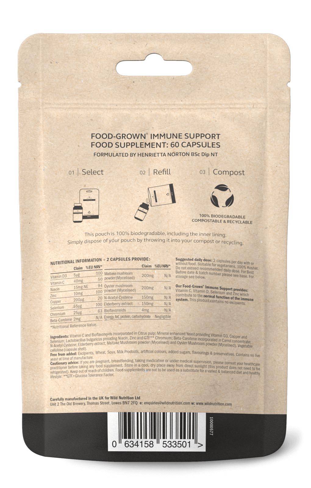 "Wild Nutrition expertly formulated Food-Grown® Immune Support is a powerful blend of biomass mycelial mushrooms, N Acetyl Cysteine, Elderberry and Food-Grown® vitamins and minerals to support the normal function of the immune system and promote our natural defences against infection.This unique product includes the pioneering process of mycellial biomass to produce their mushrooms. This intensifies the immune supporting properties of beta-glucans, polysaccharides and antioxidants, enzymes super oxide dismutase and glutathione peroxidase naturally found in mushroom complexes."