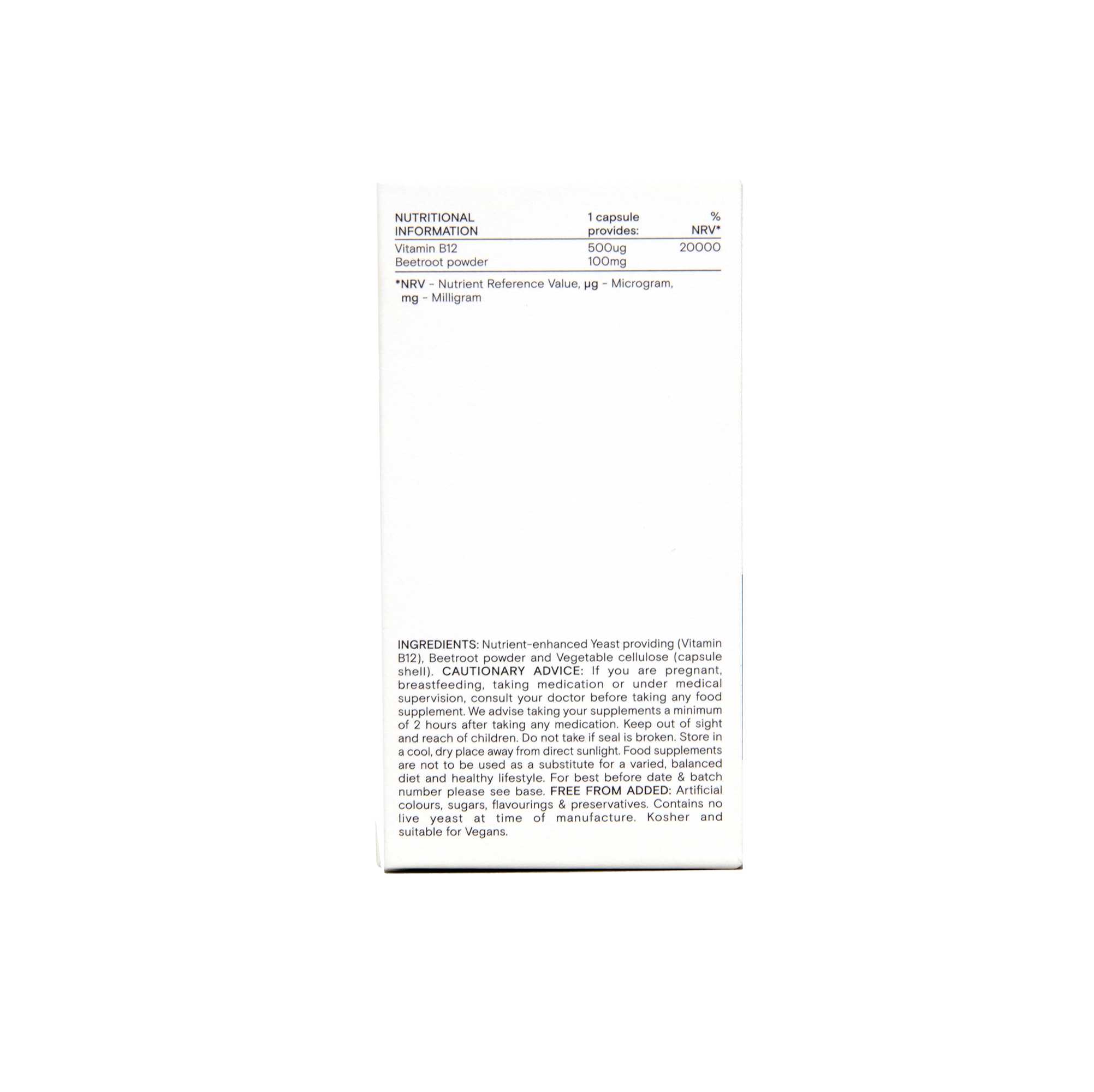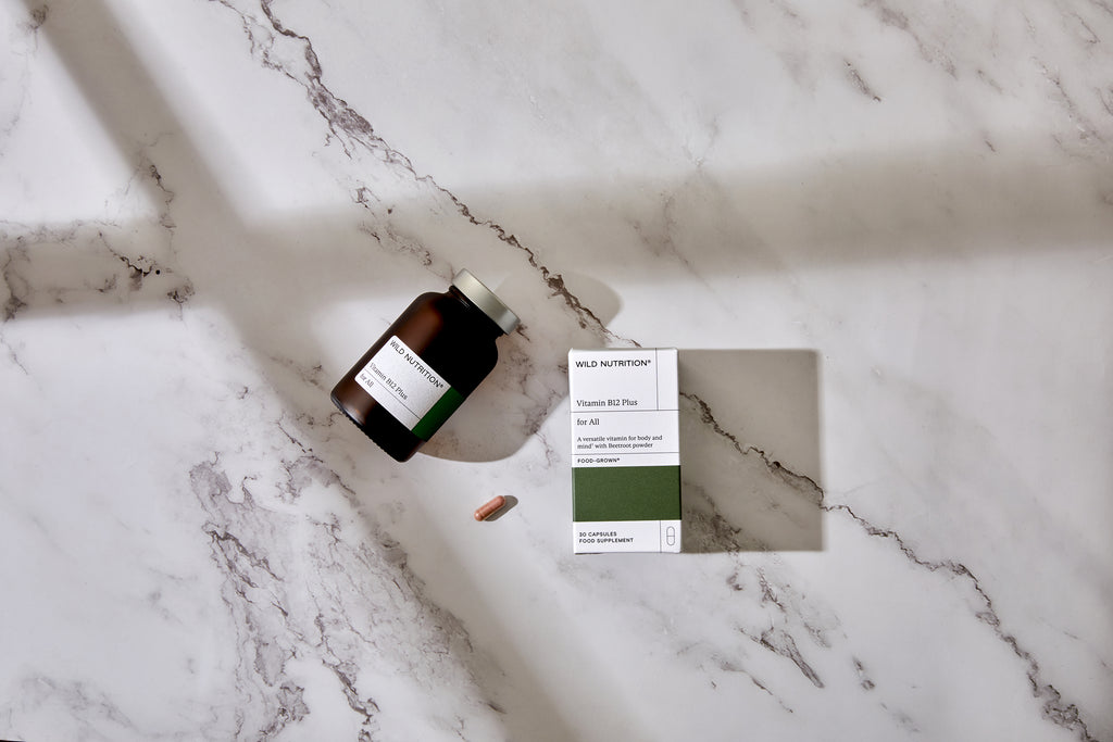 "B12 is a hardworking vitamin, supporting healthy blood cells, energy release and the nervous system too. Found in meat, fish, dairy and cereals, it’s a great nutritional support for vegan and vegetarian diets. This products contains key nutrients including… Vitamin B12 in the natural form of methylcobalaminVitamin B12 in the natural form of deoxyadenosylcobalaminBeetroot powder"
