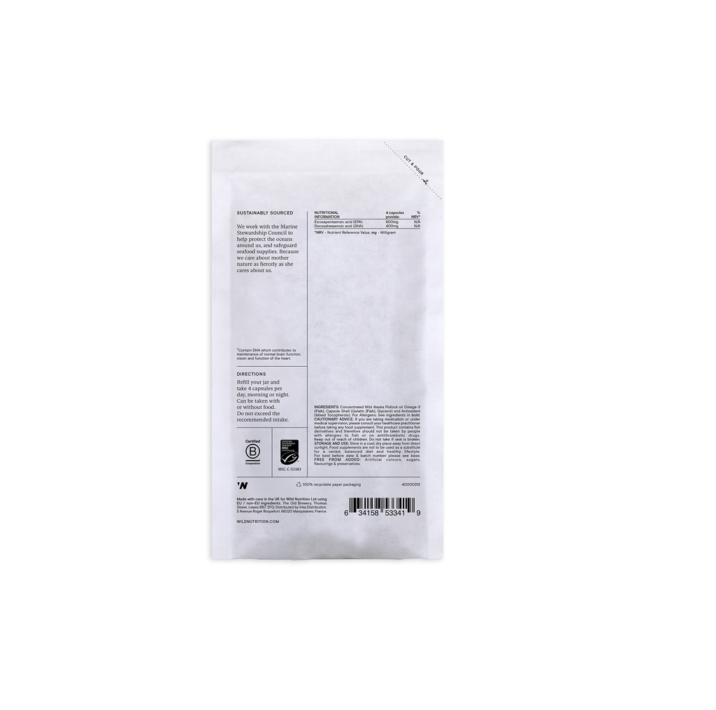 "Supporting the health of your heart, brain and eyes, Wild Nutritons Pure Strength Omega 3 provides the ideal 2:1 ratio of EPA (eicosapentaenoic acid) and DHA (docosahexaenoic acid). Wild Nutrition source their Alaskan Pollock through the Marine Stewardship Council to help protect the oceans around us and safeguard seafood supplies. Freshness and purity are paramount to this sustainably-sourced formula."