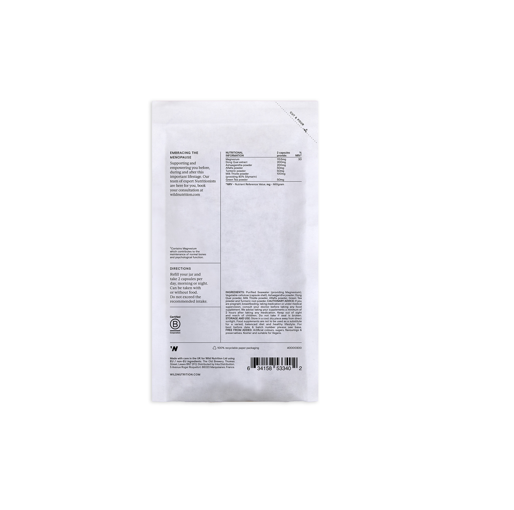 "Botanical blend with Magnesium for use before, during and after the Menopause. Menopause can be a challenging stage of life so Wild Nutrition designed botanical menopause formula to support you through the menopause and beyond. This botanical formula provides a considered range of ingredients for women to take during this important life stage. Key benefits: Mental resiliance, Supports muscle and joints, Reduce tiredness and fatigue, Suppors nervous system, Sense of Equilibrium"