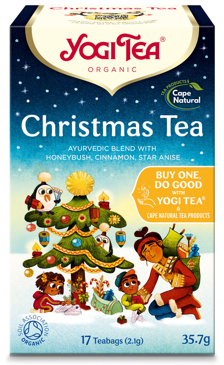 This Christmas blend from Yogi Tea has been created to capture the favourite flavours of Christmas in an organic tea. Ayurvedic blend with honeybush, cinnamon, star anise. Ayurvedic Herb and Spice infusion.